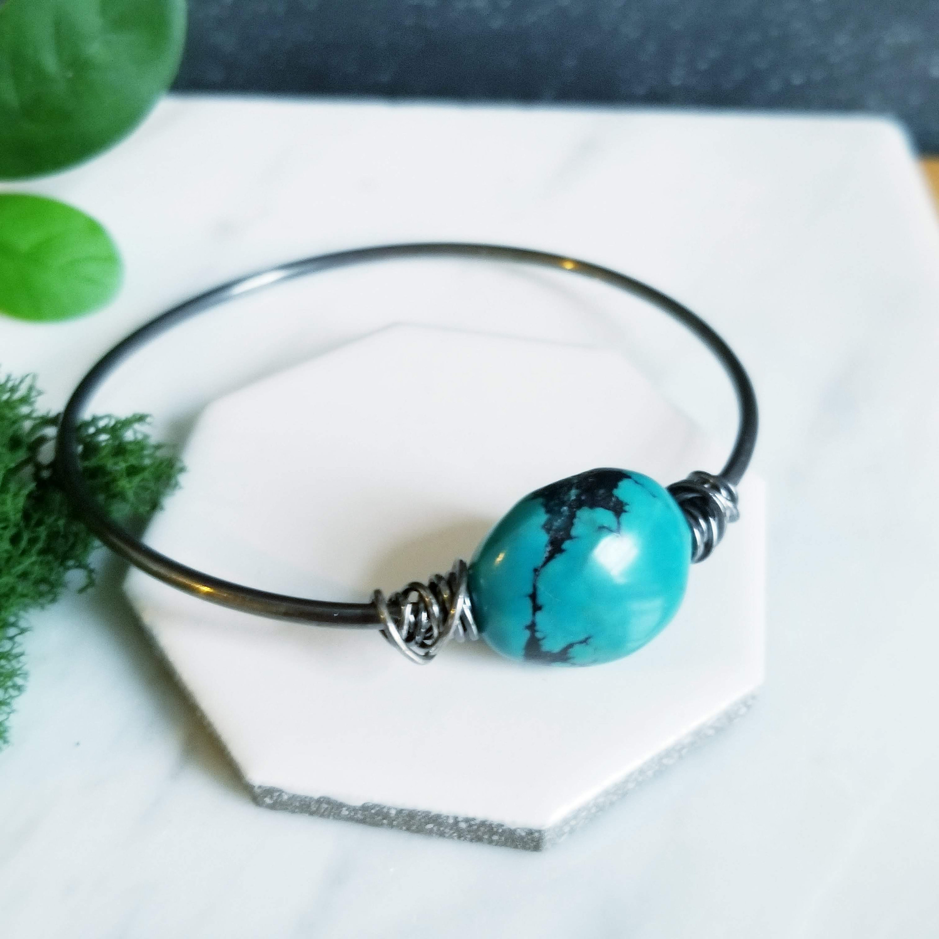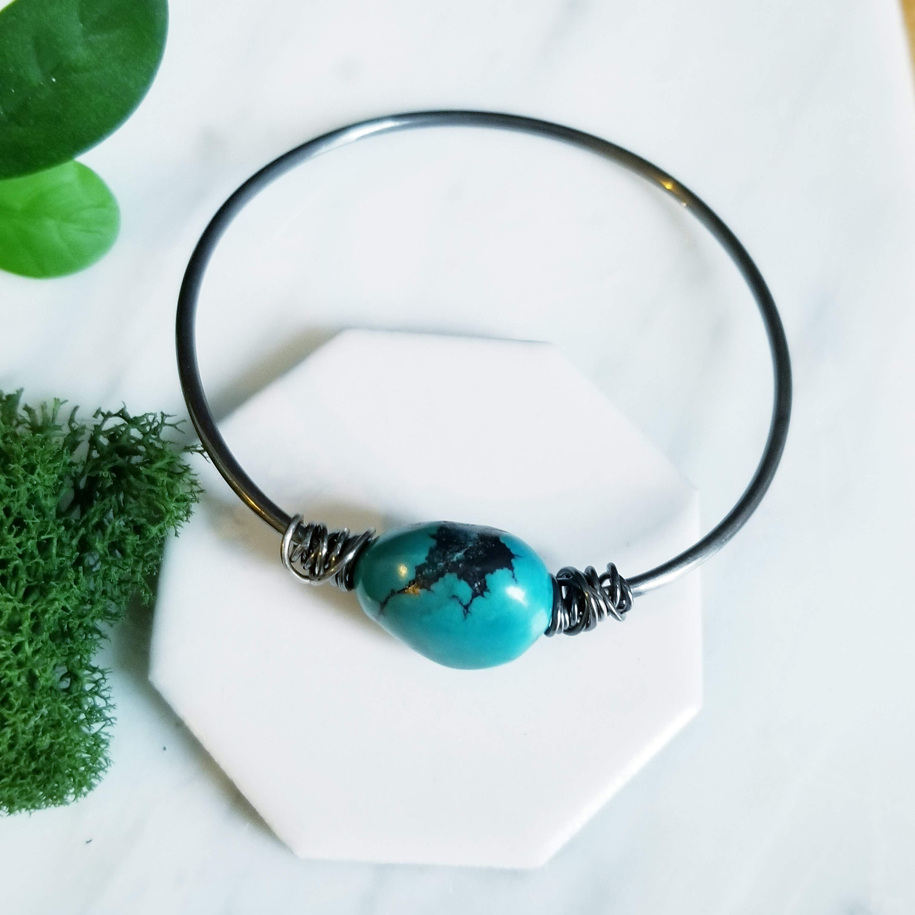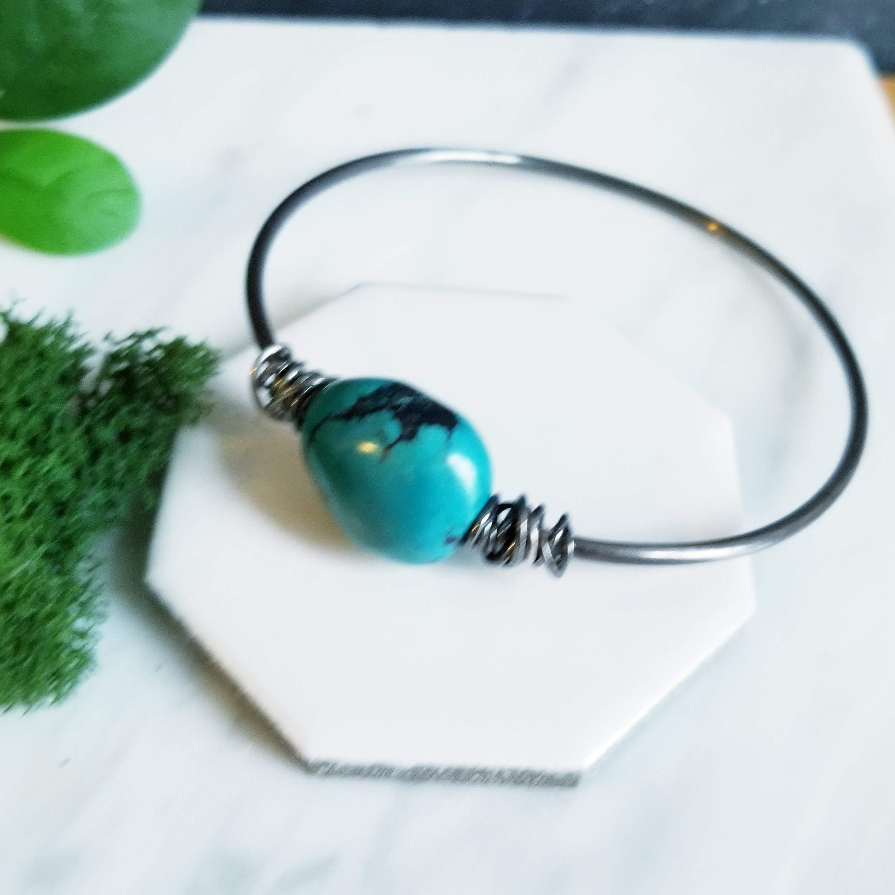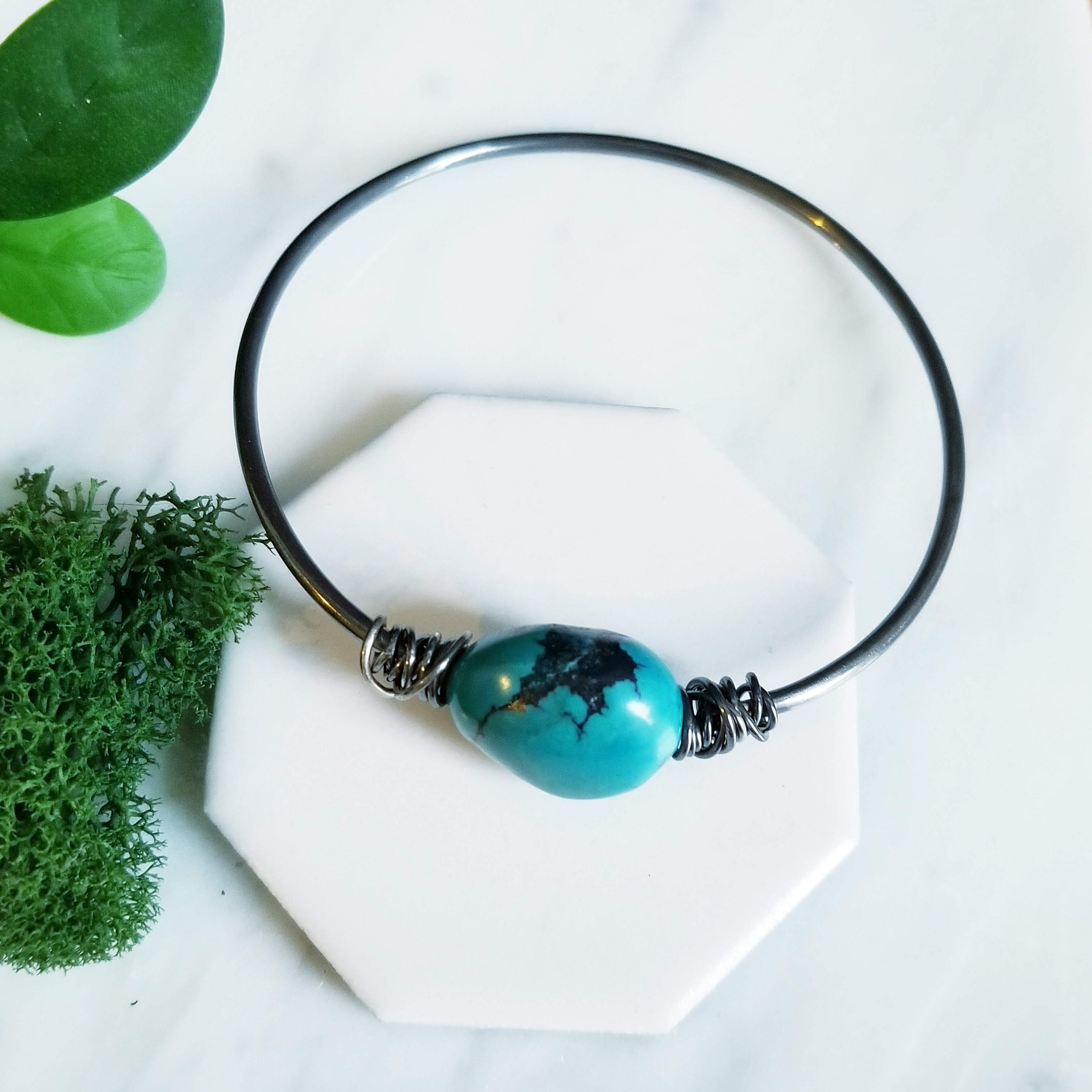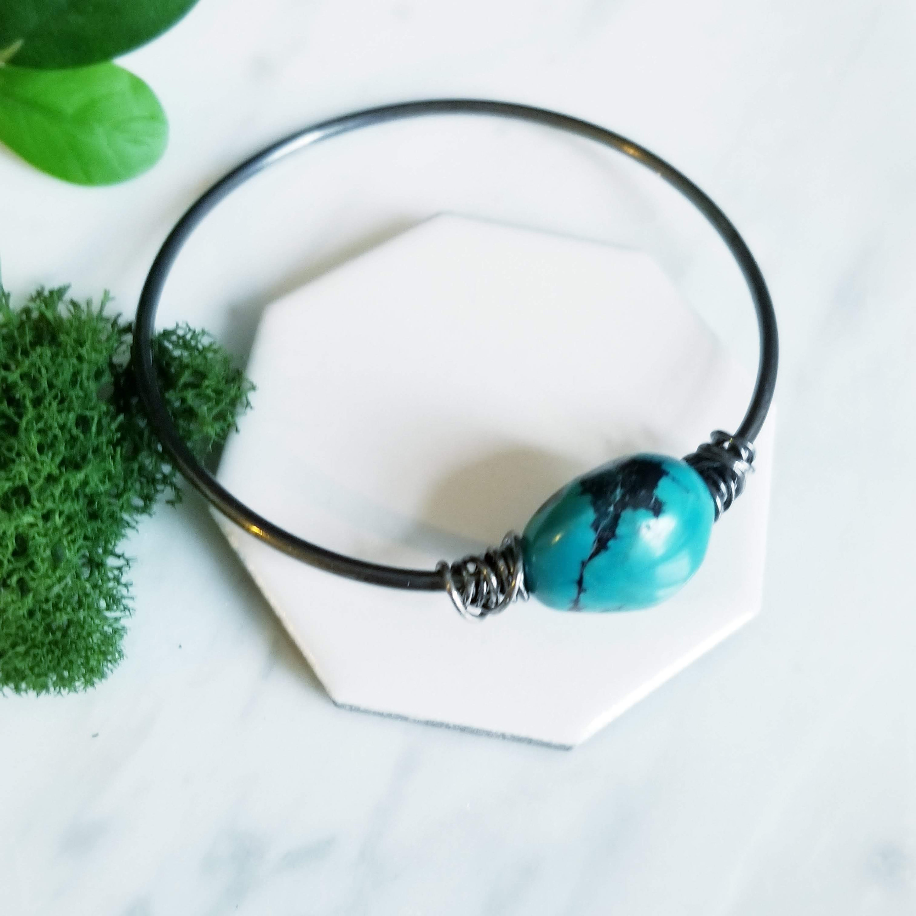 Slide this Sterling Silver and Turquoise Stone stacking Bangle onto your arm alone or intersperse it with slimmer sterling silver bangles. It has been given a light patina.
