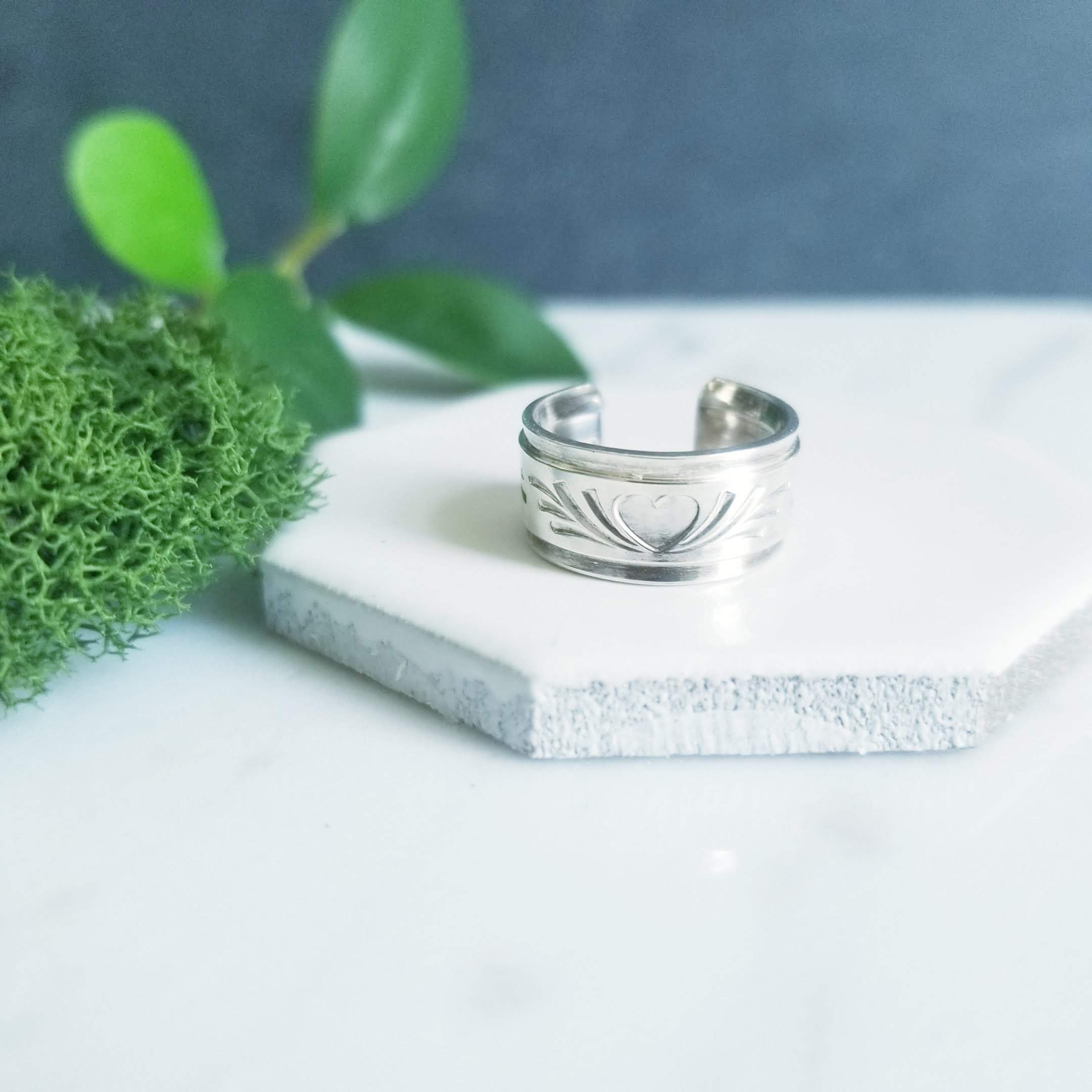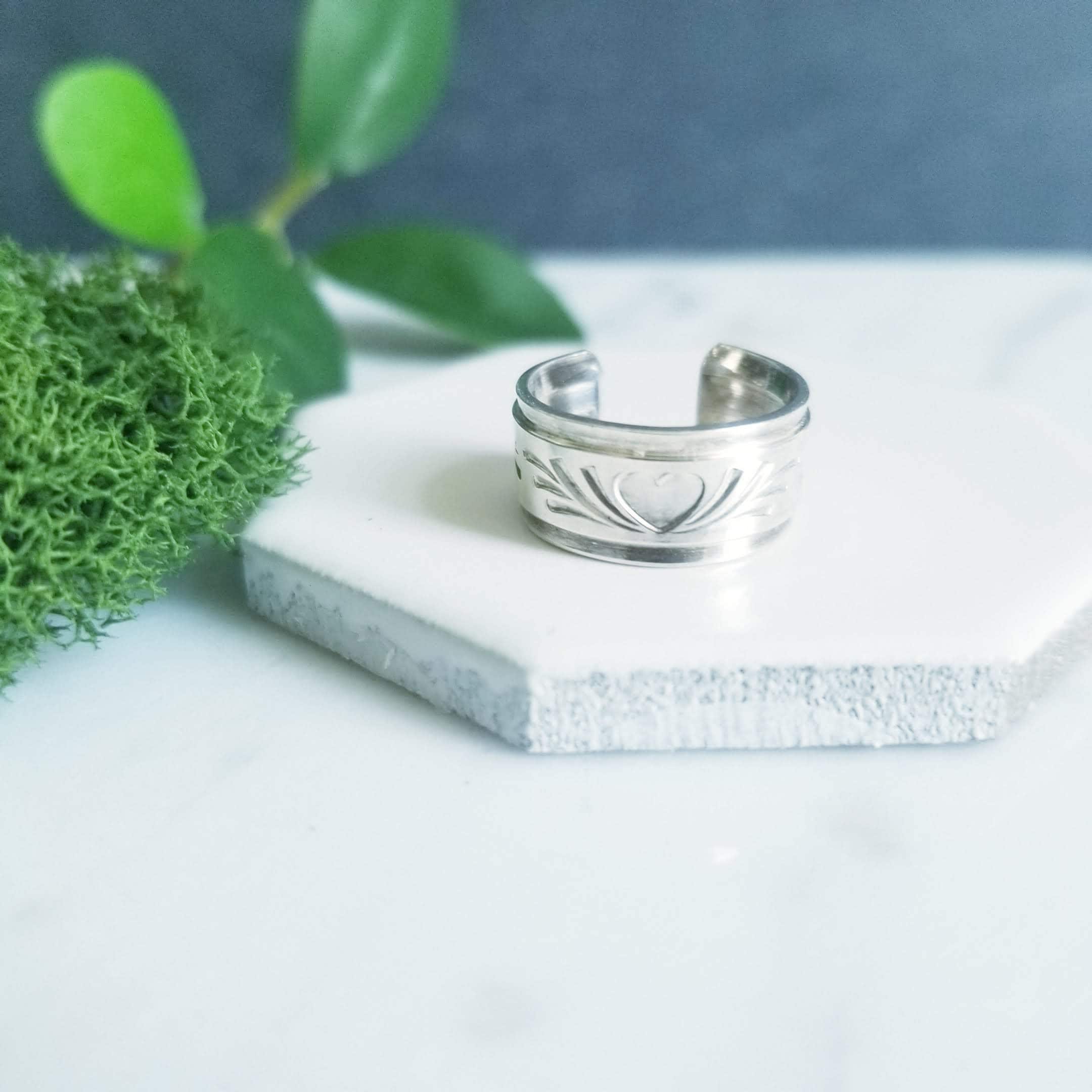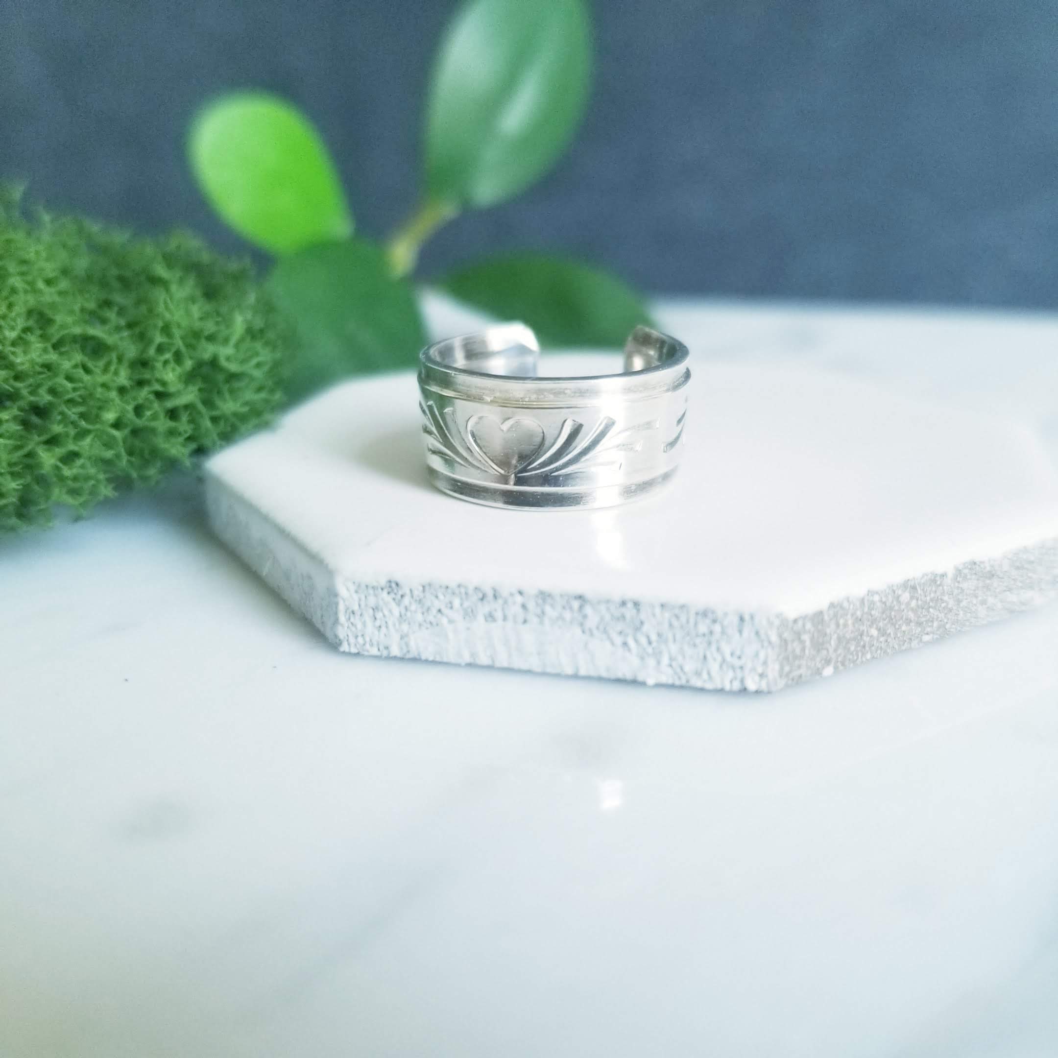 Wide sterling silver toe ring in an embossed heart and Flourish design.