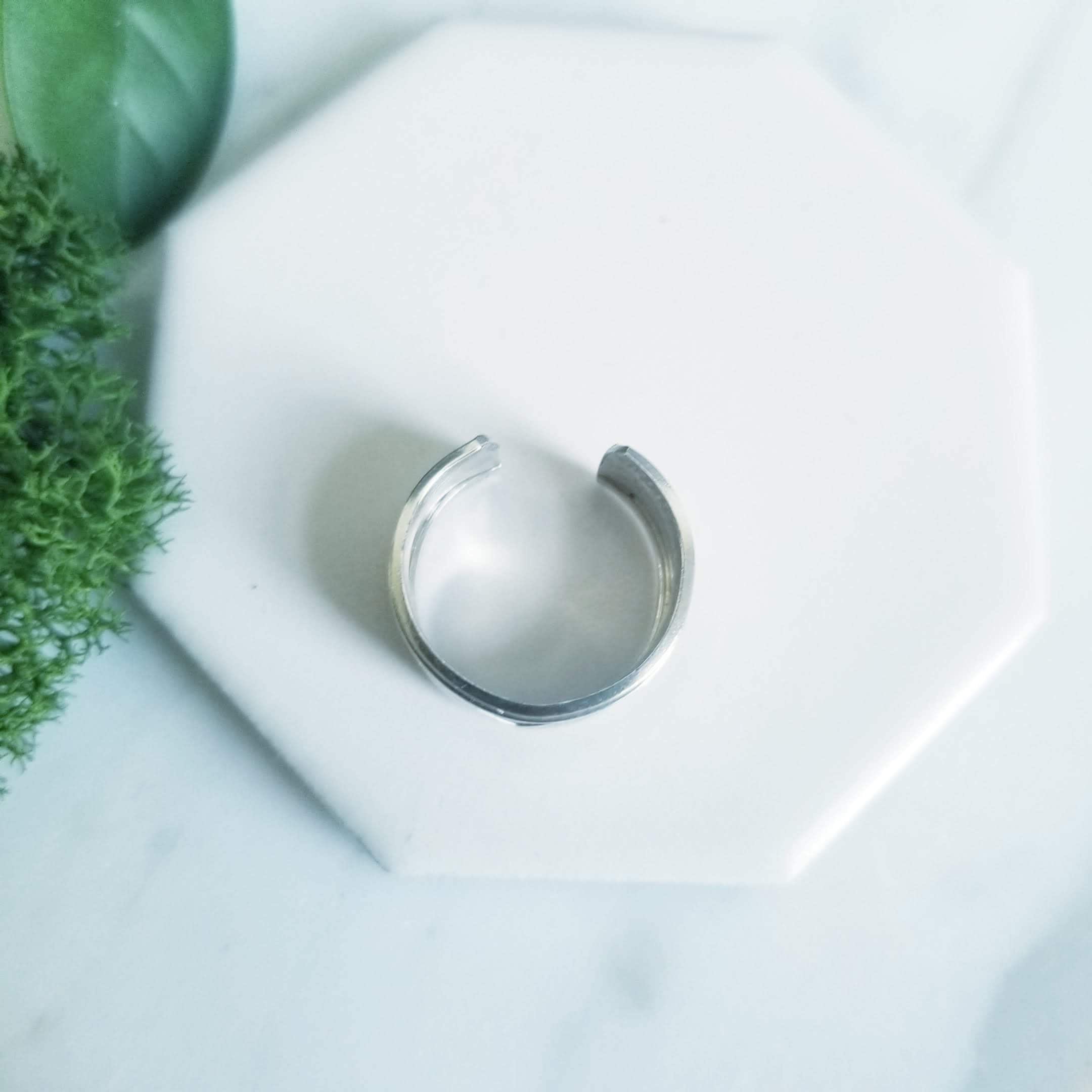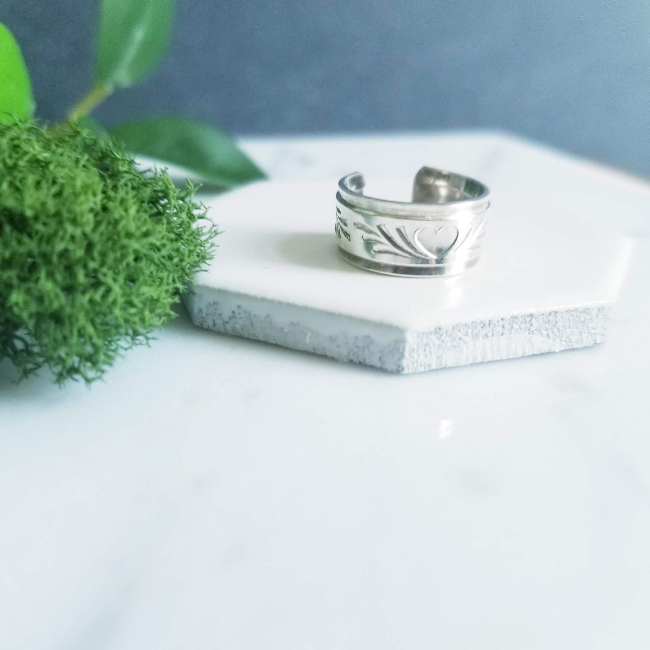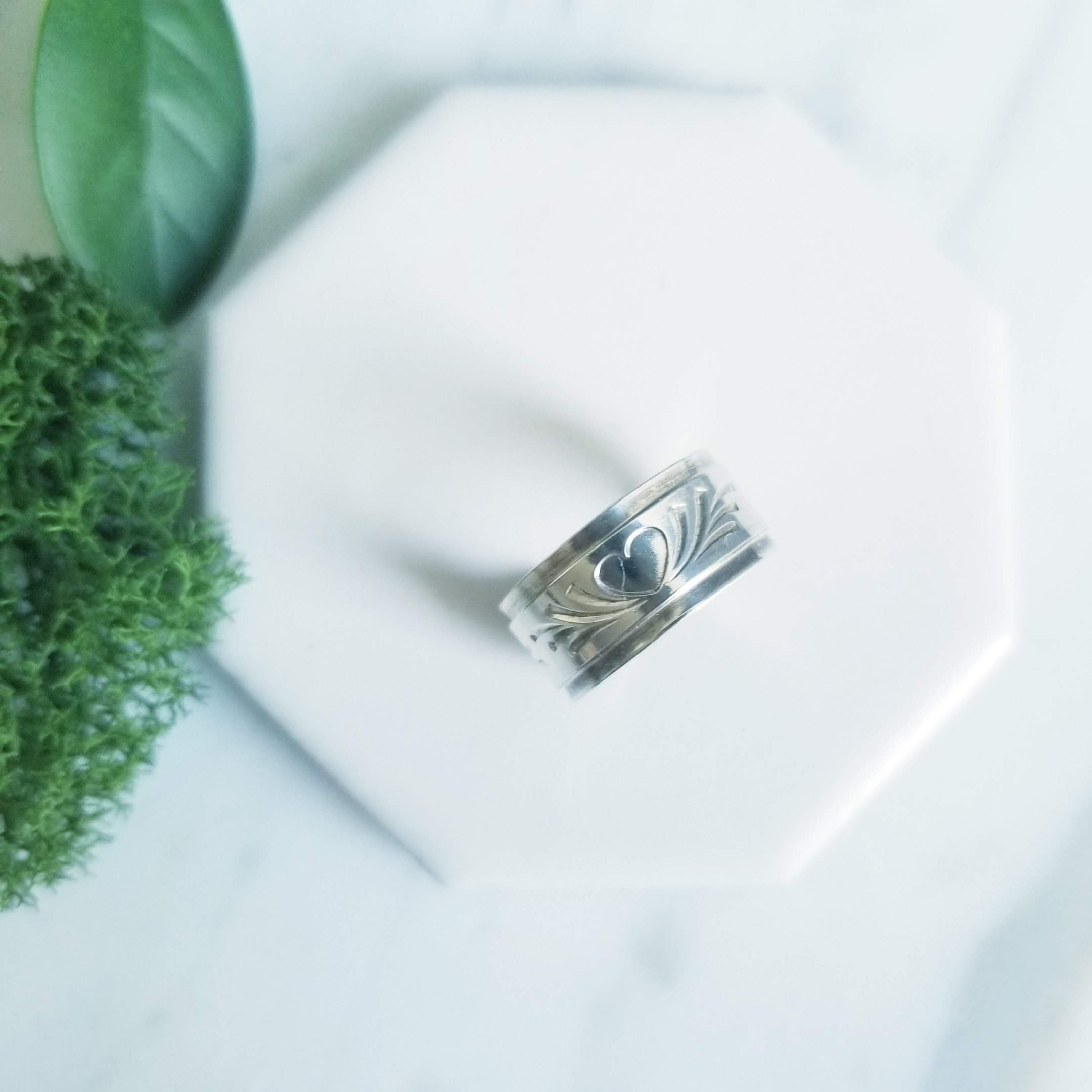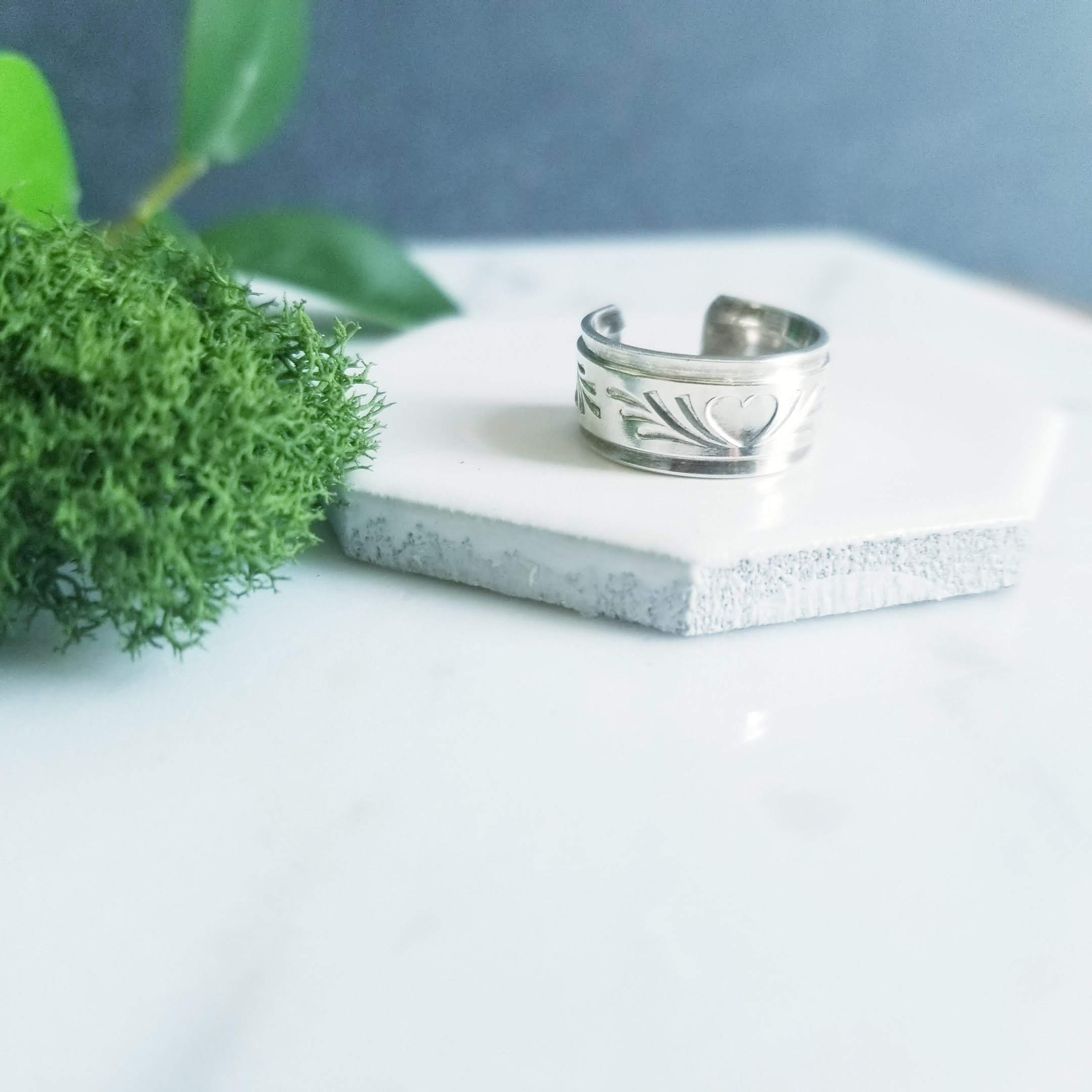 Wide sterling silver toe ring in an embossed heart and Flourish design.