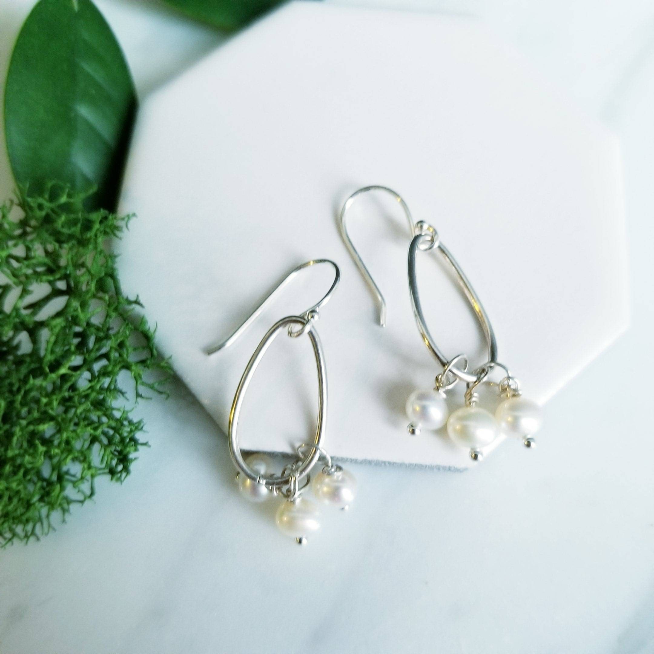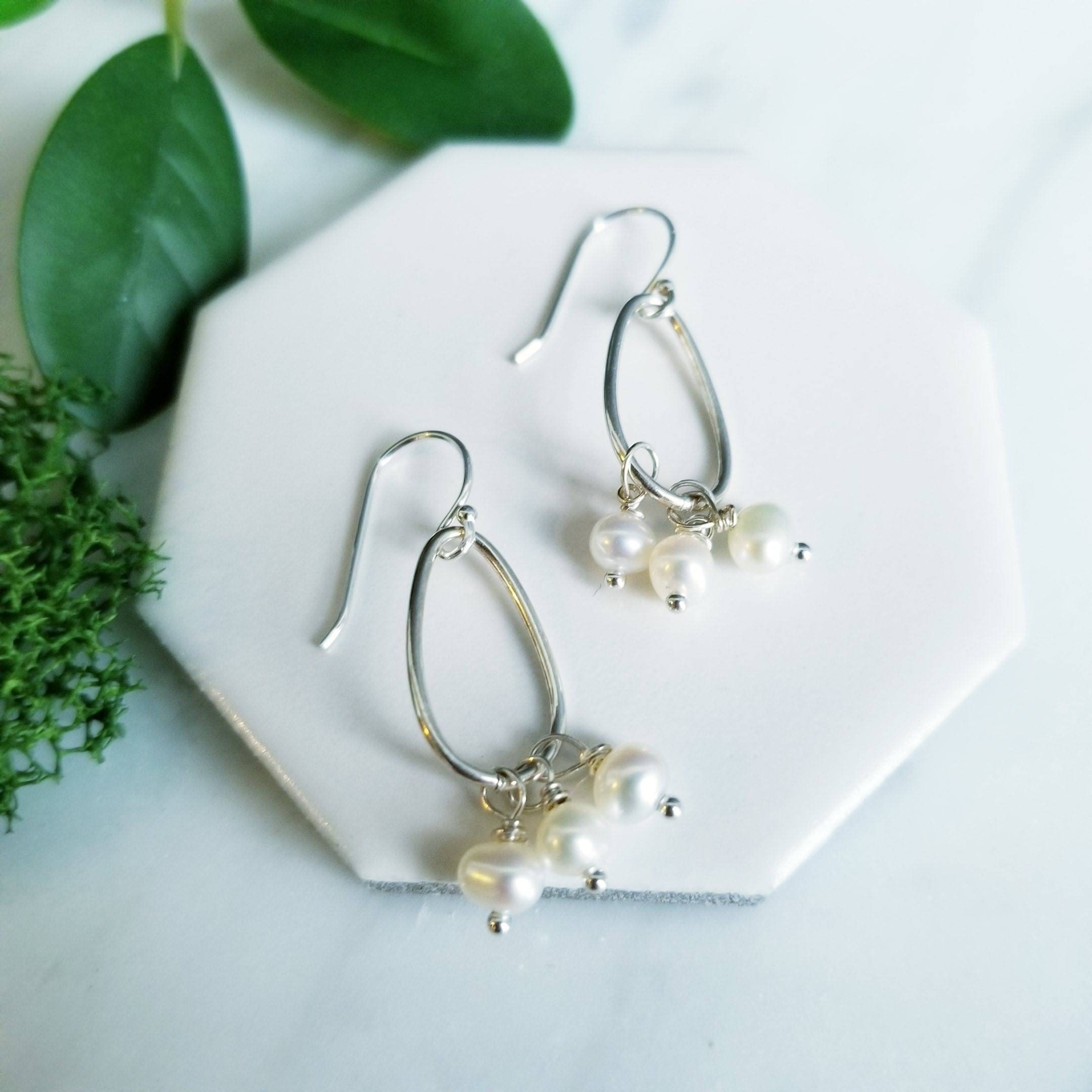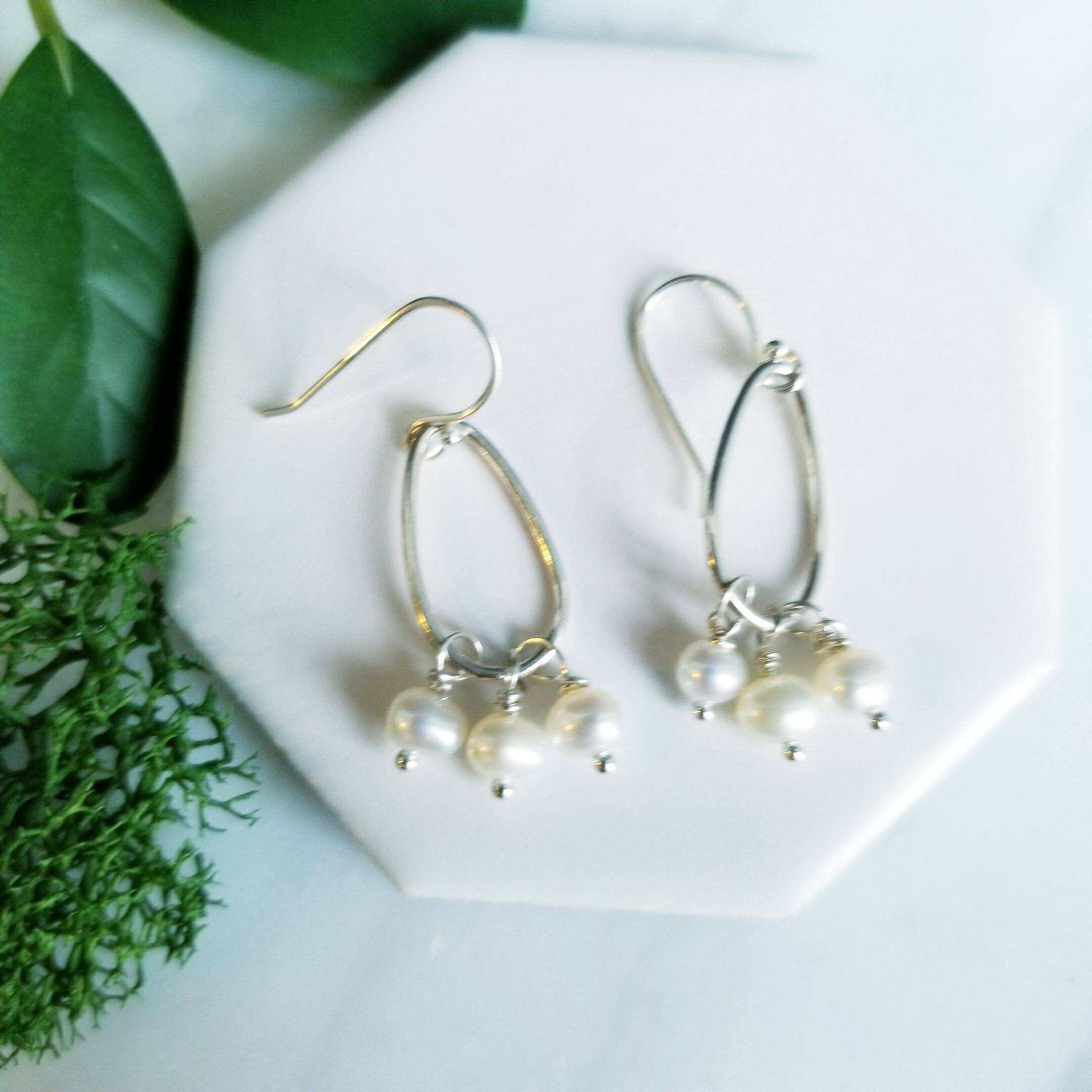 Pretty white pearls are wire-wrapped to a oval wedge shaped sterling silver earring.