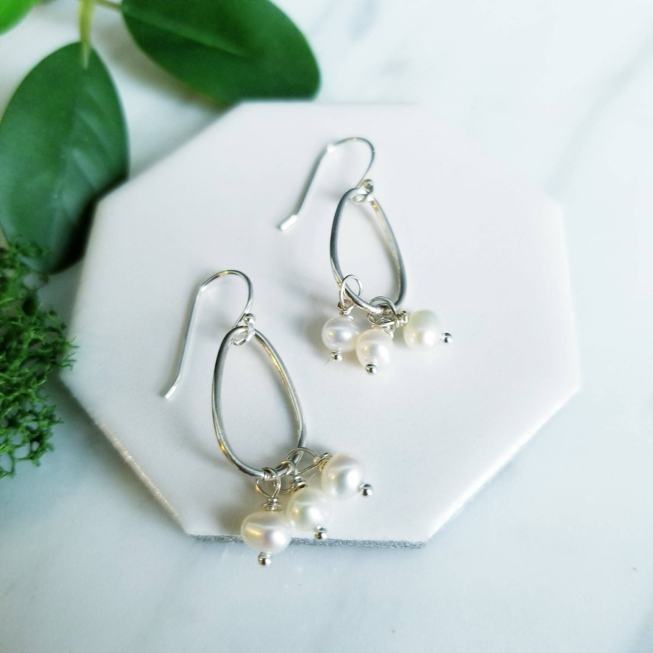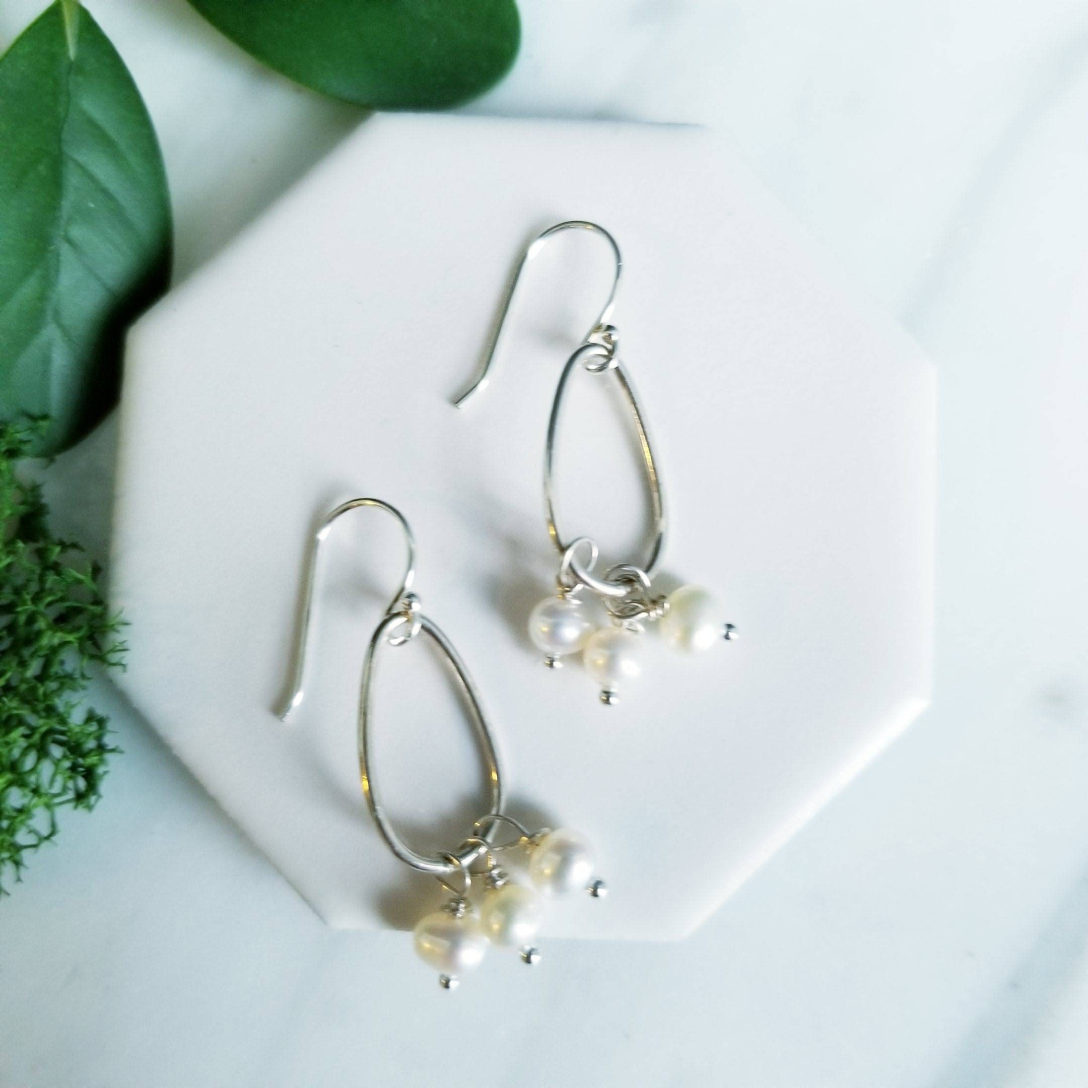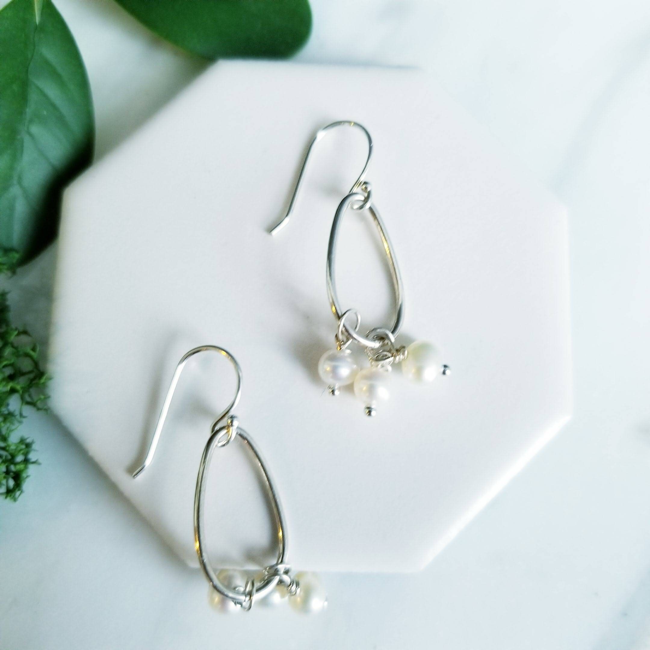Pretty white pearls are wire-wrapped to a oval wedge shaped sterling silver earring.