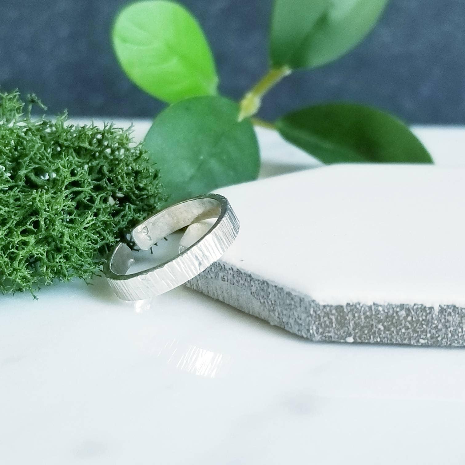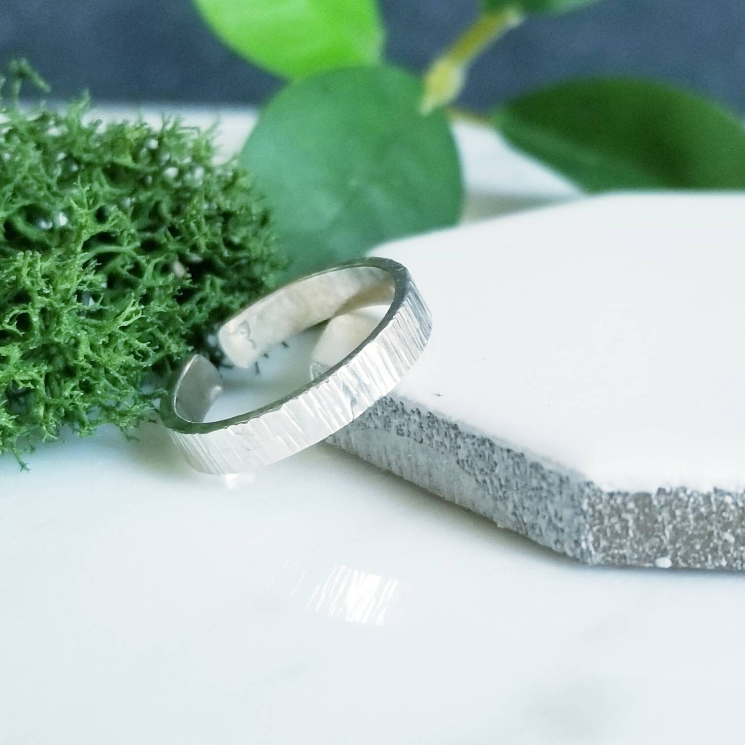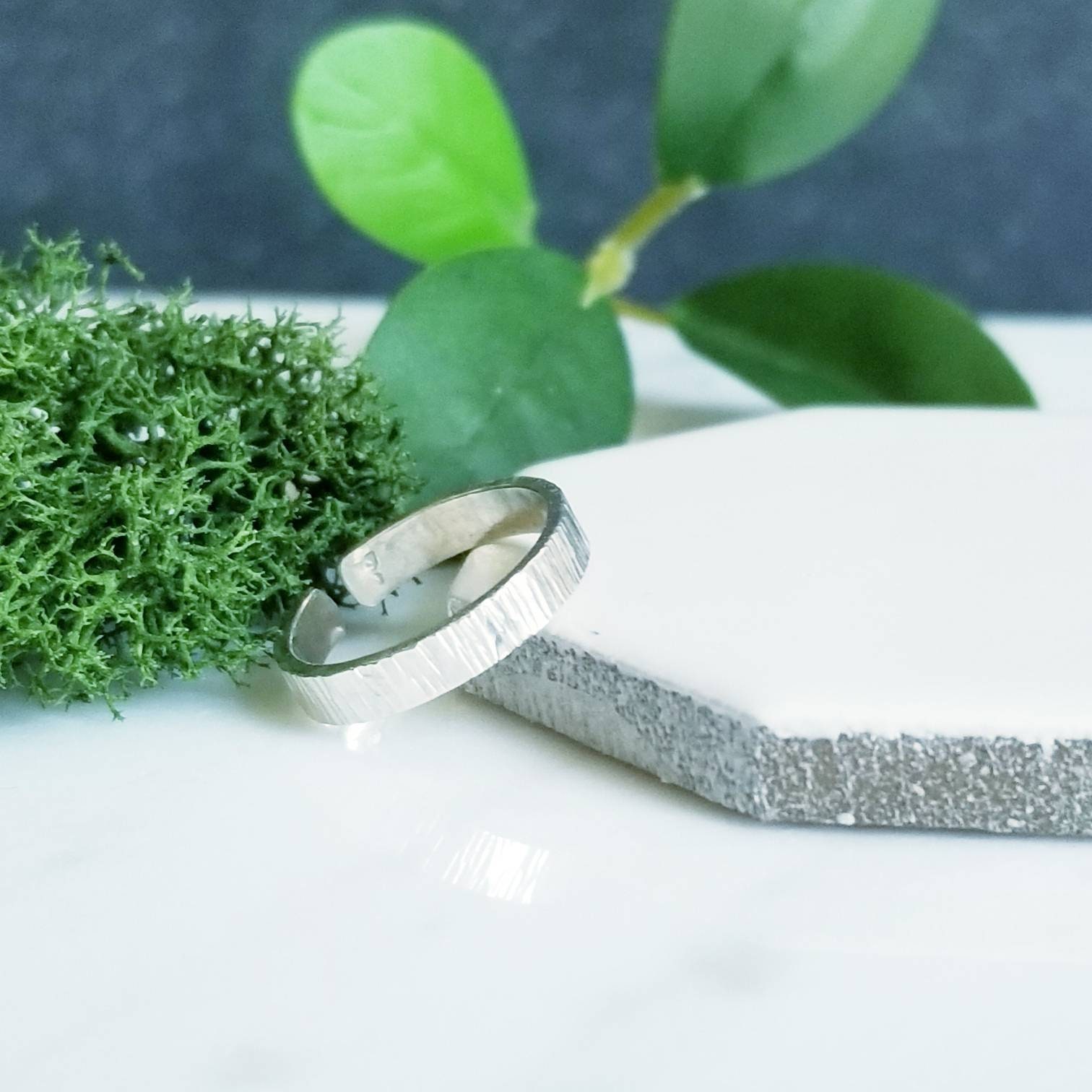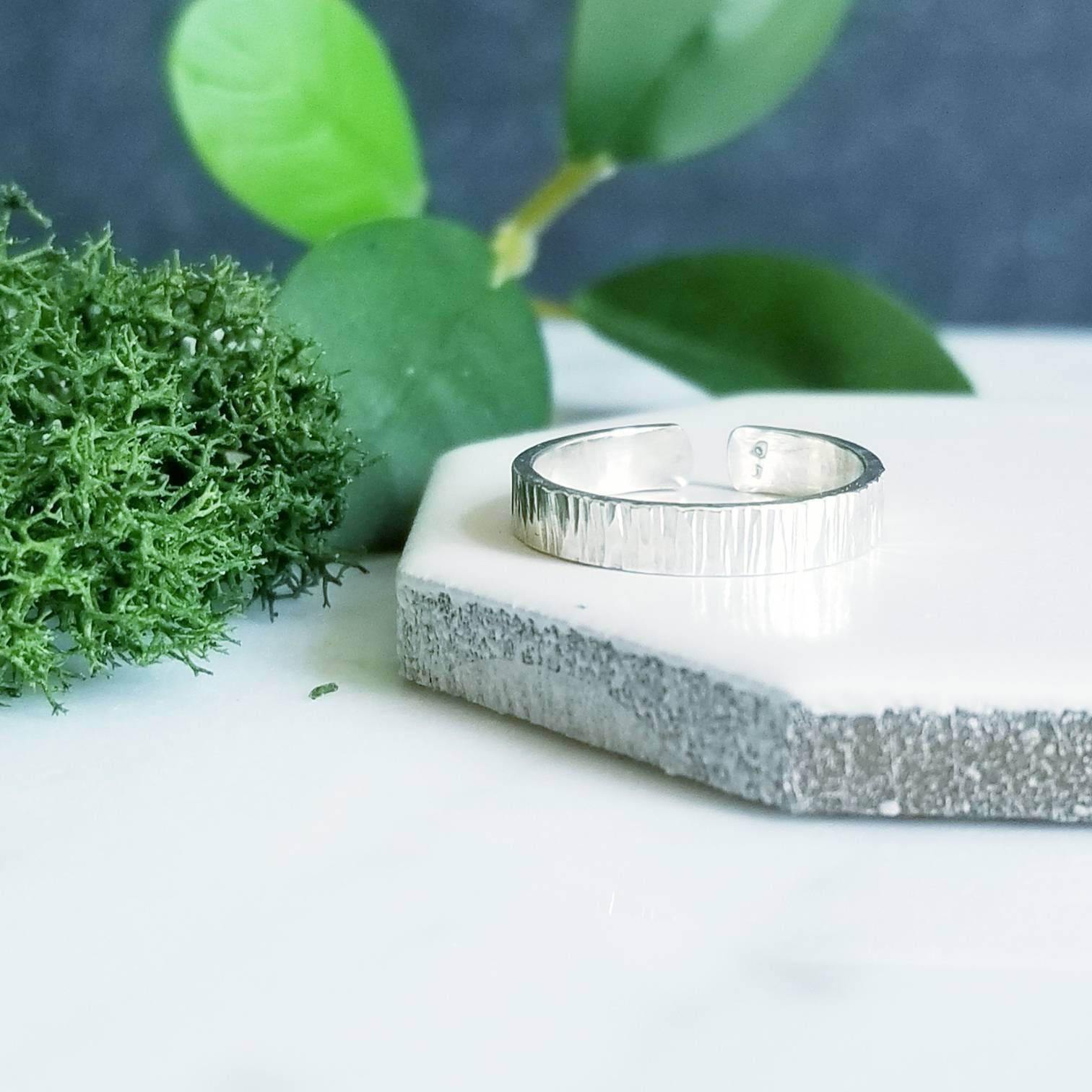 A textured, striated, so comfortable toe ring in 3mm flat wire. Easily adjusted by gently squeezing it shut or gently expanding the wire.