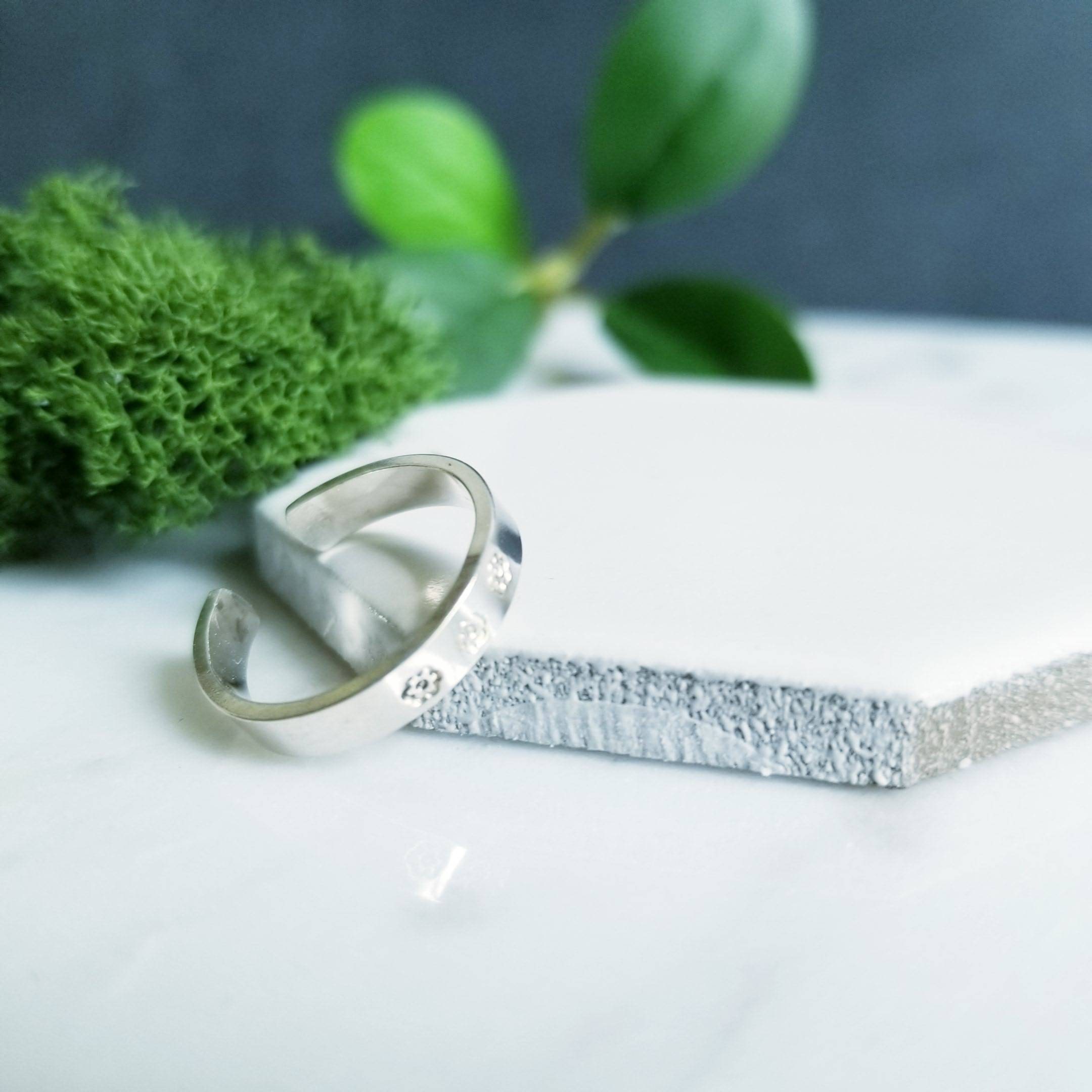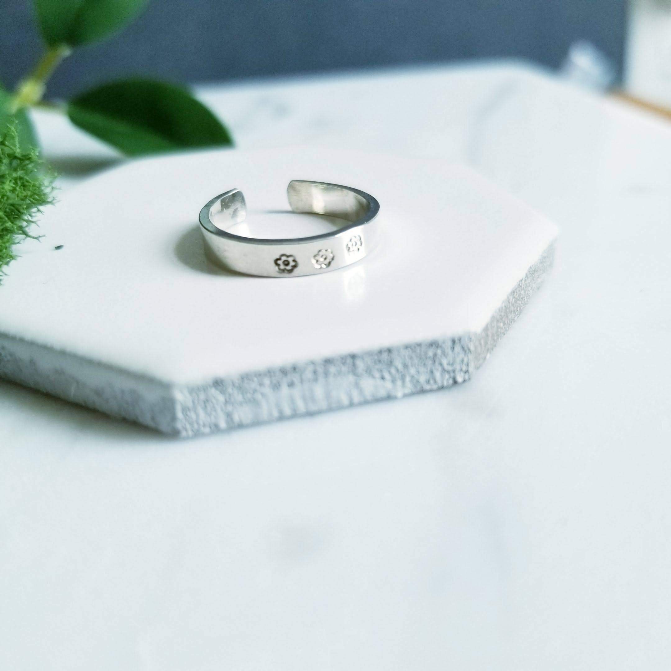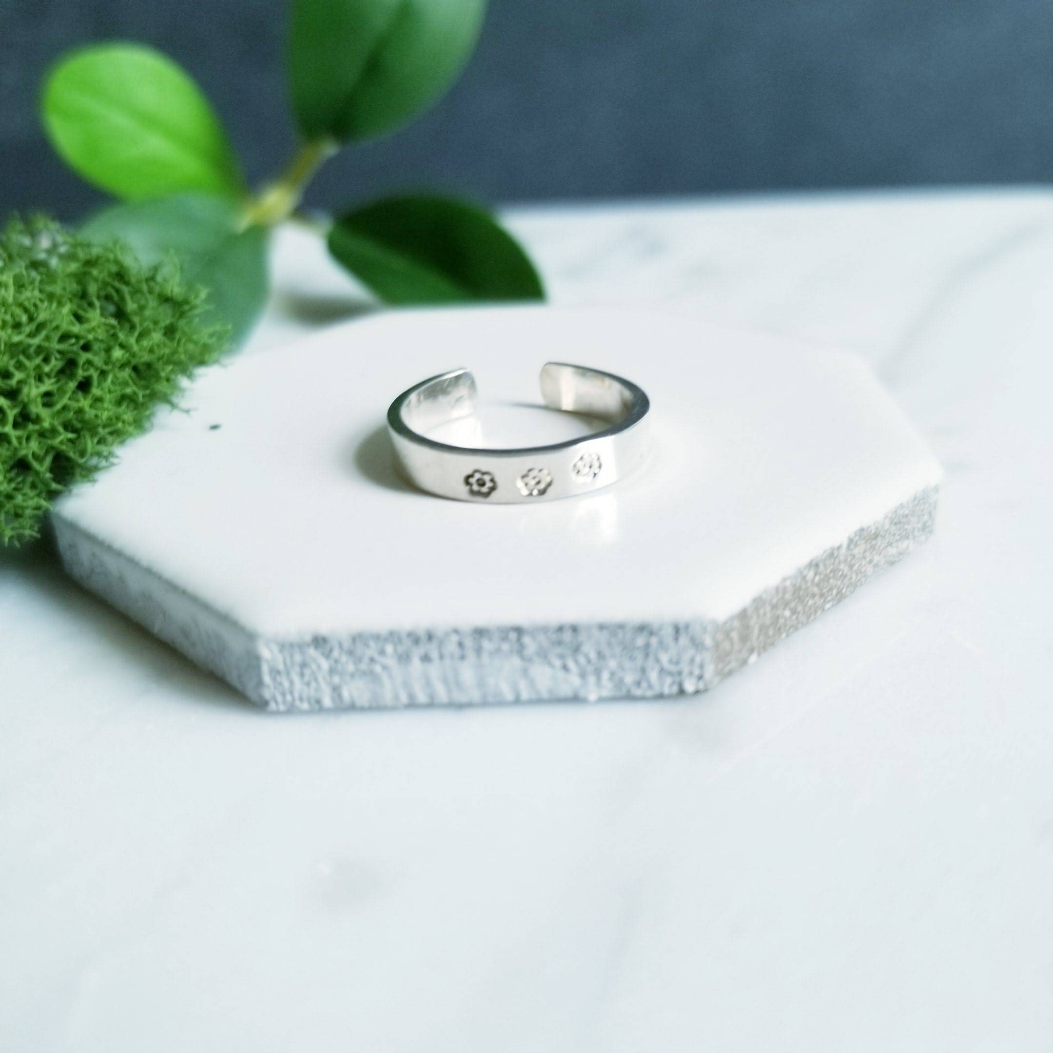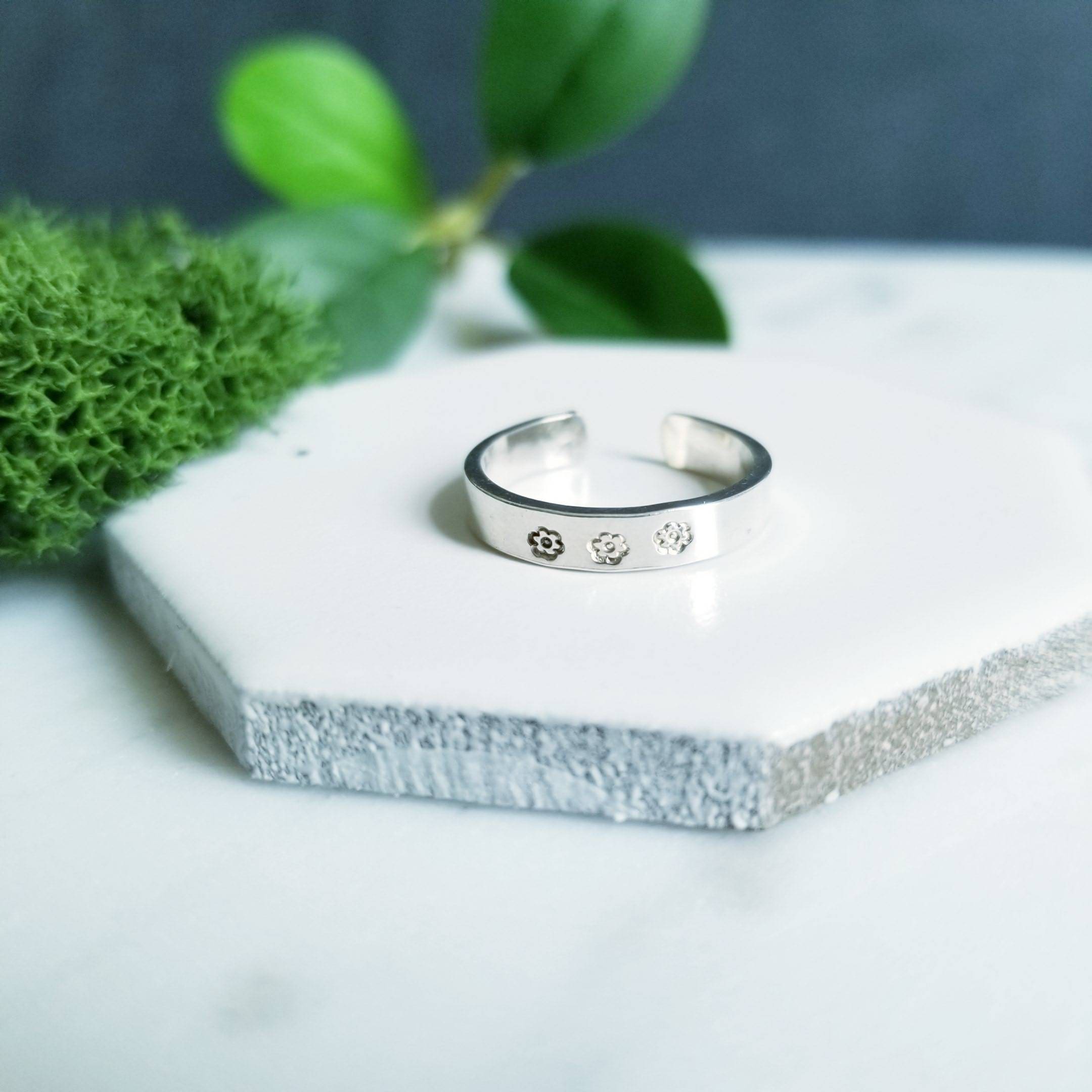 Three tiny little stamped daisies dance across the front of this sterling silver toe ring.