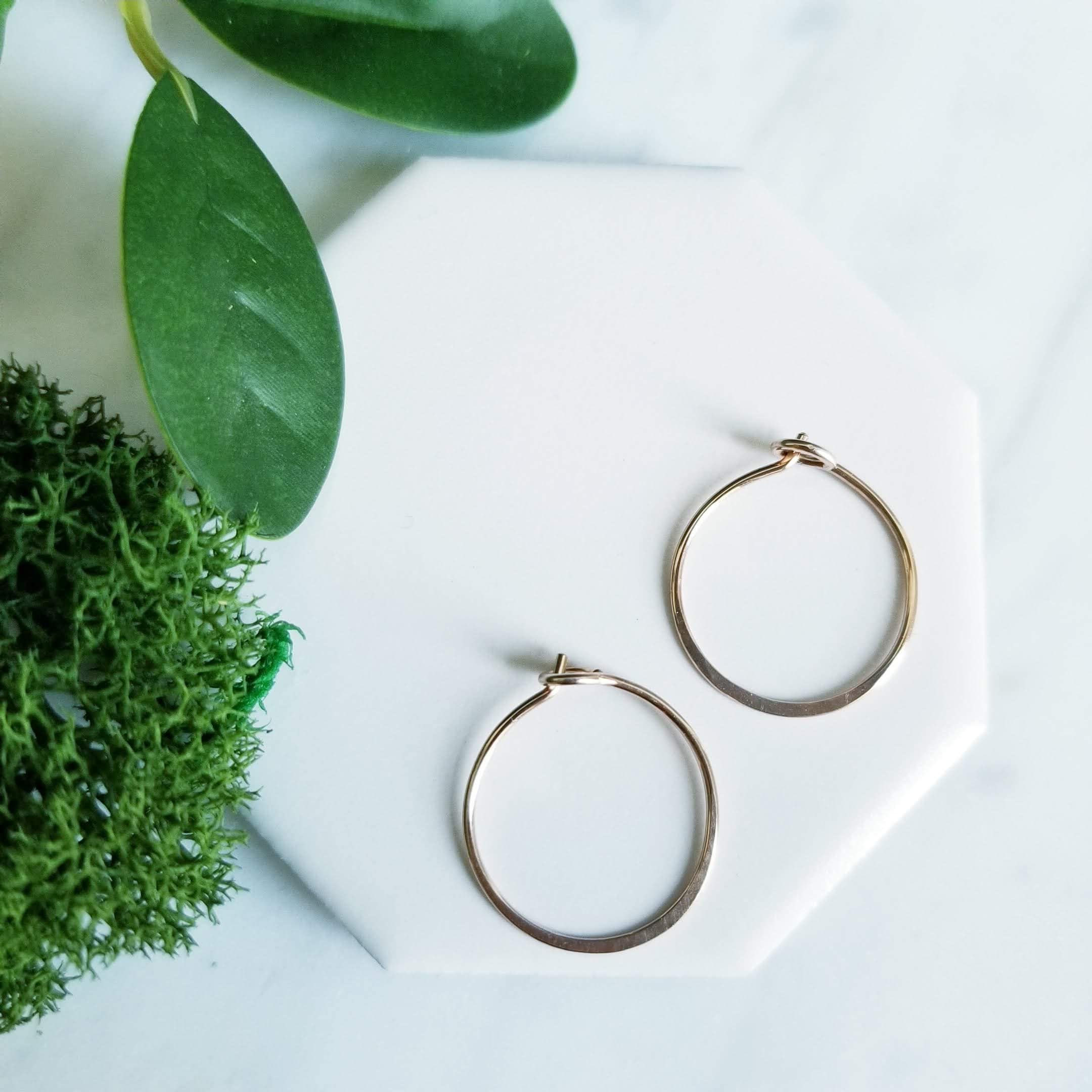 Lightweight huggy hoop or sleeper earrings made from 14K Yellow Gold Filled wire. Slightly hammered on the outer edge for strength and a bit of light catching facets...