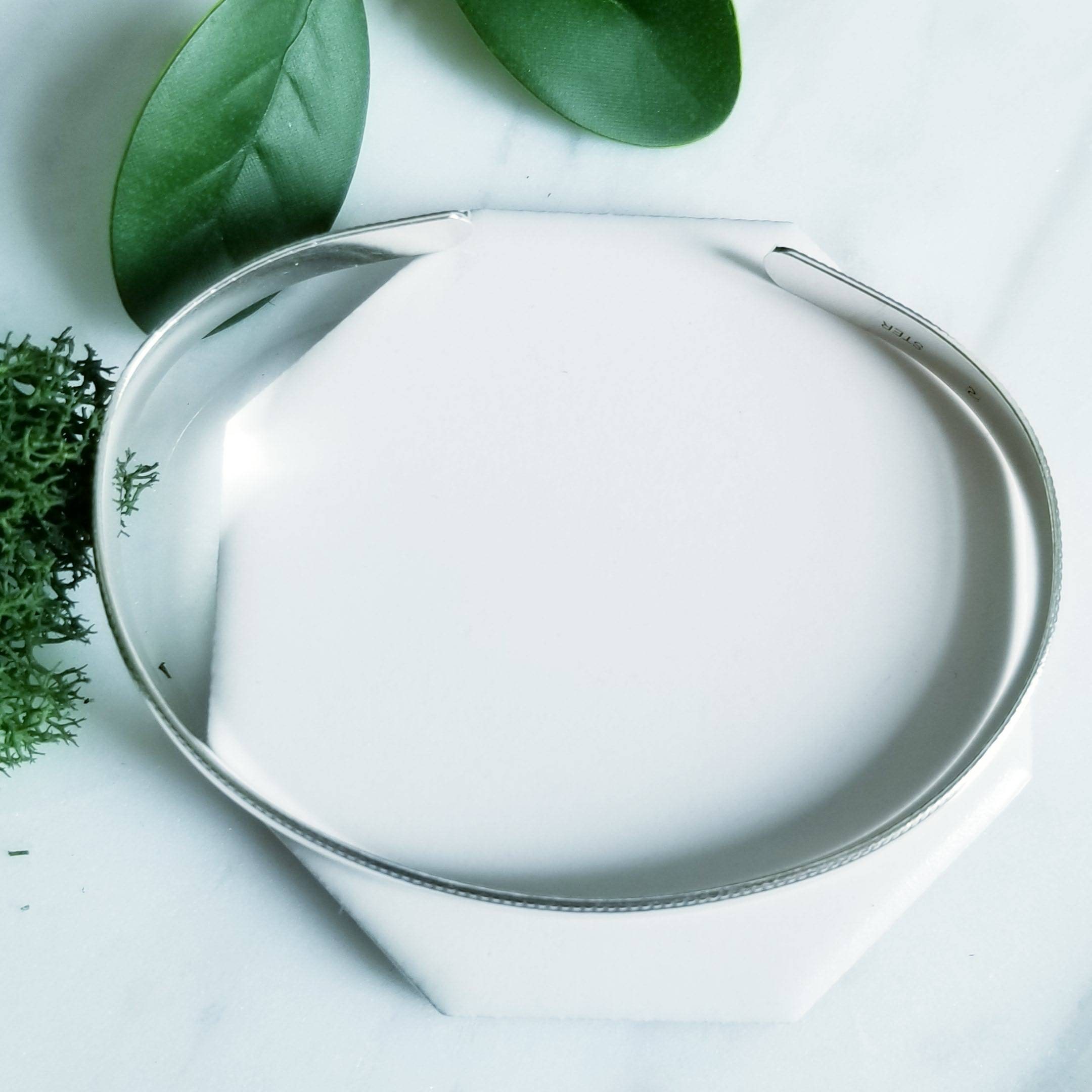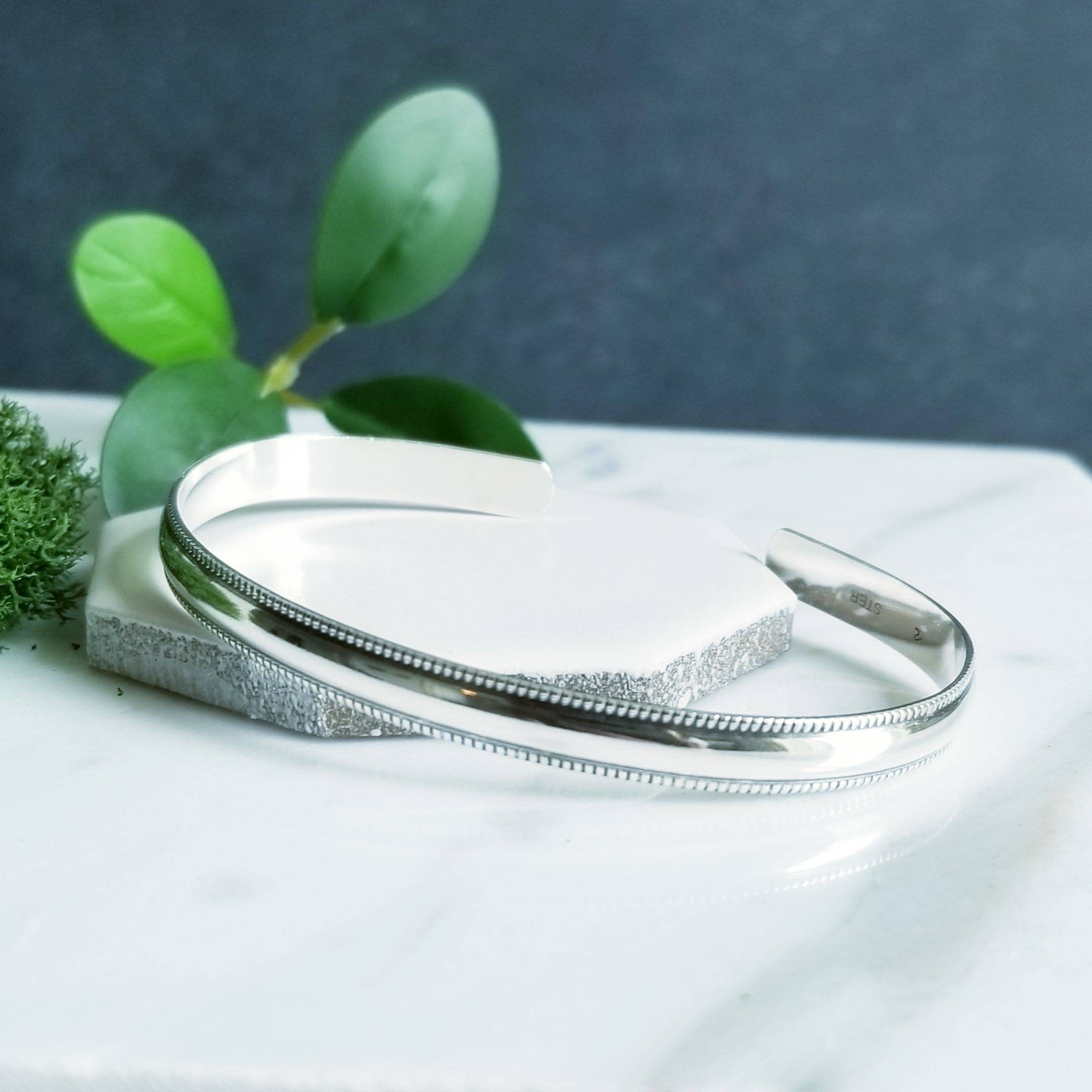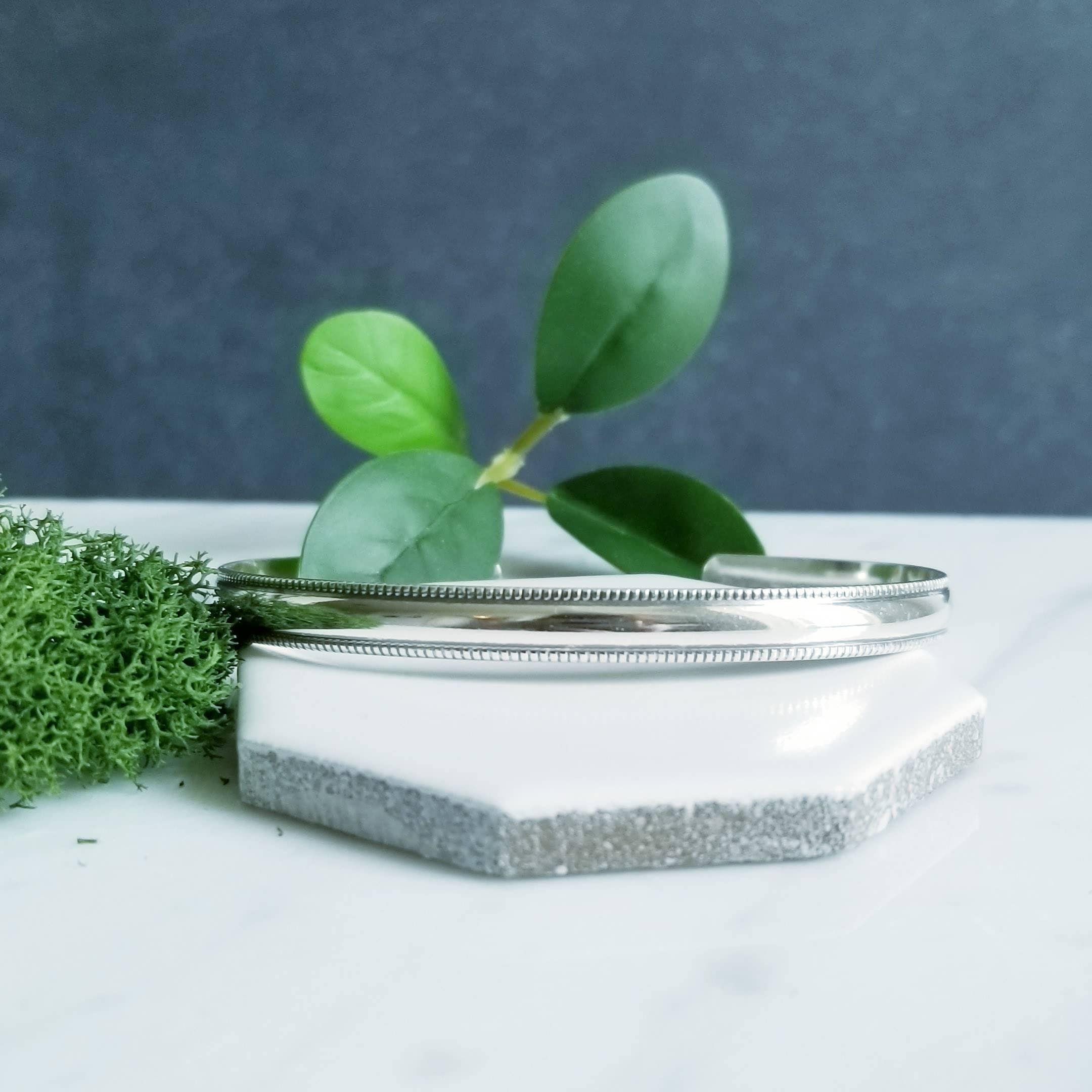 Sterling silver embossed with a smooth half round middle and textured edges, shaped into a cuff.