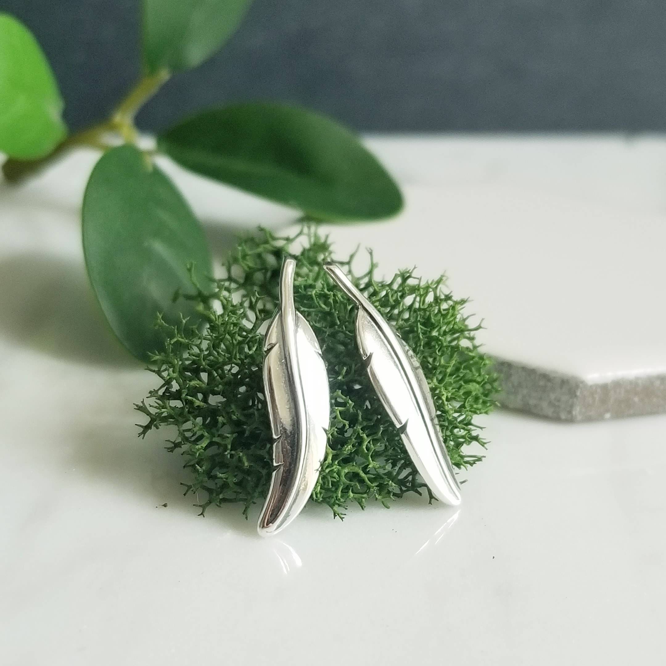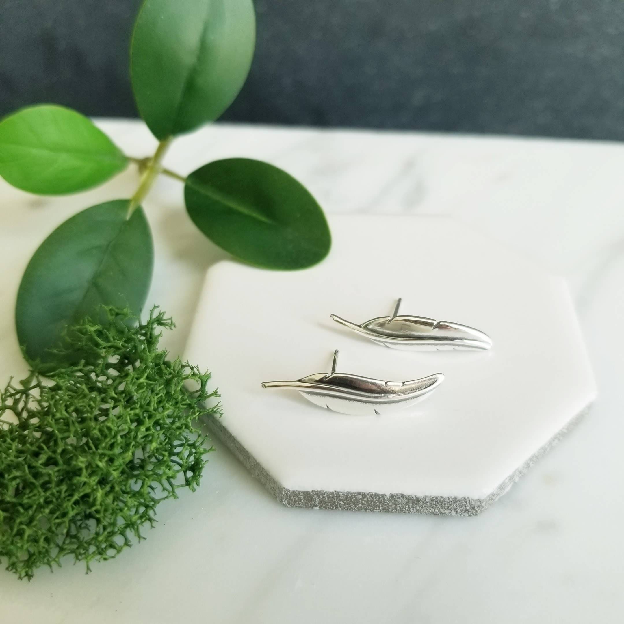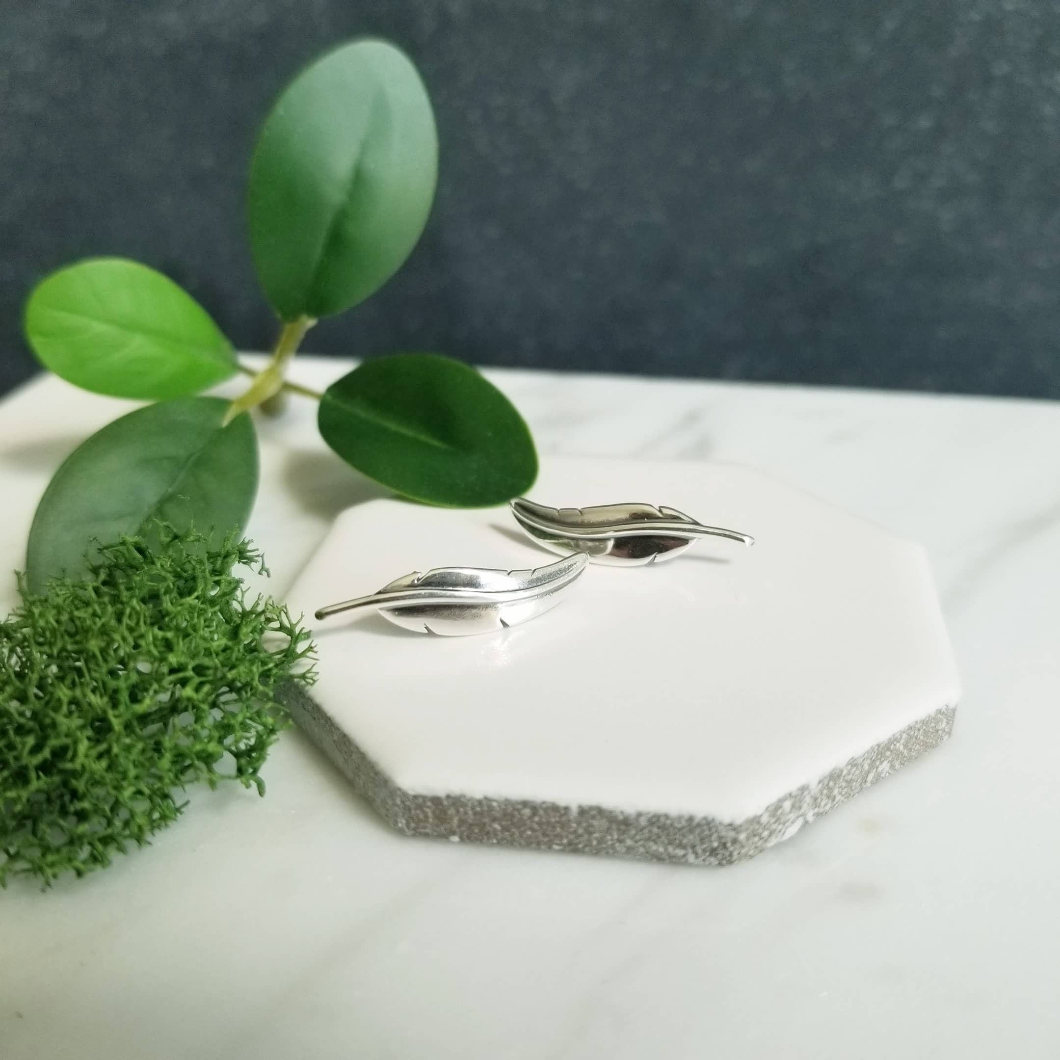 Minimalist sterling ear climbers, feather stud earrings.