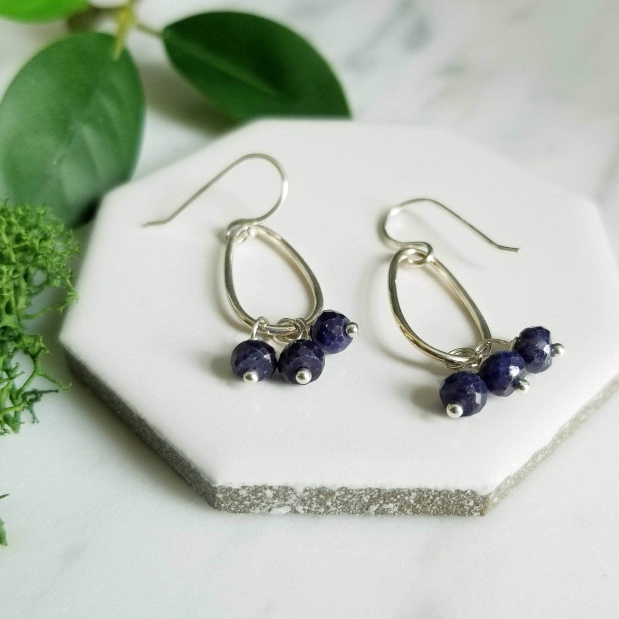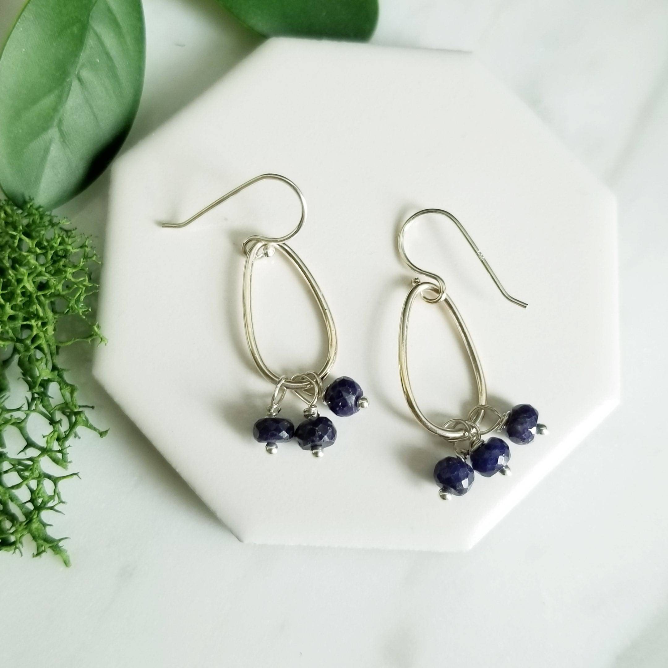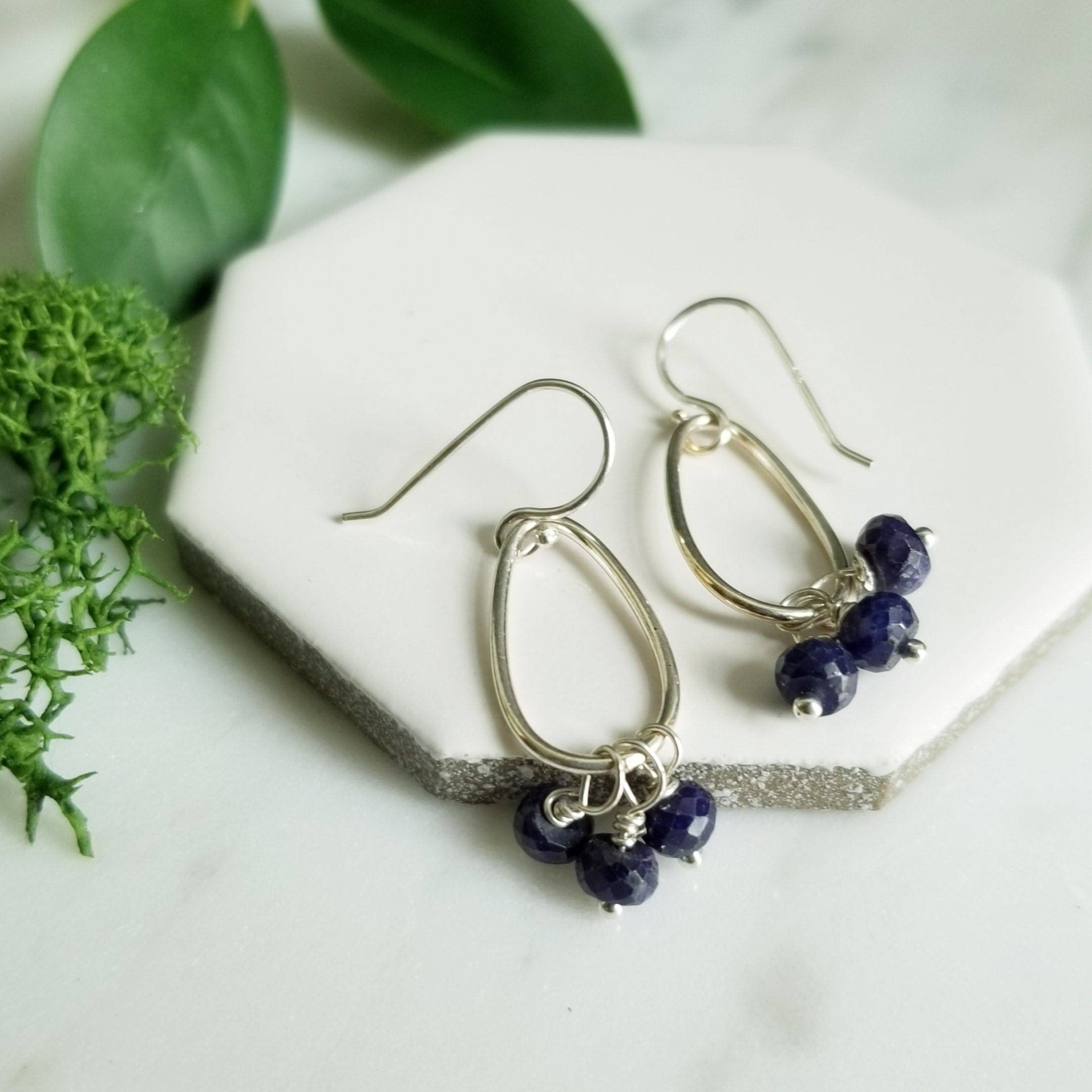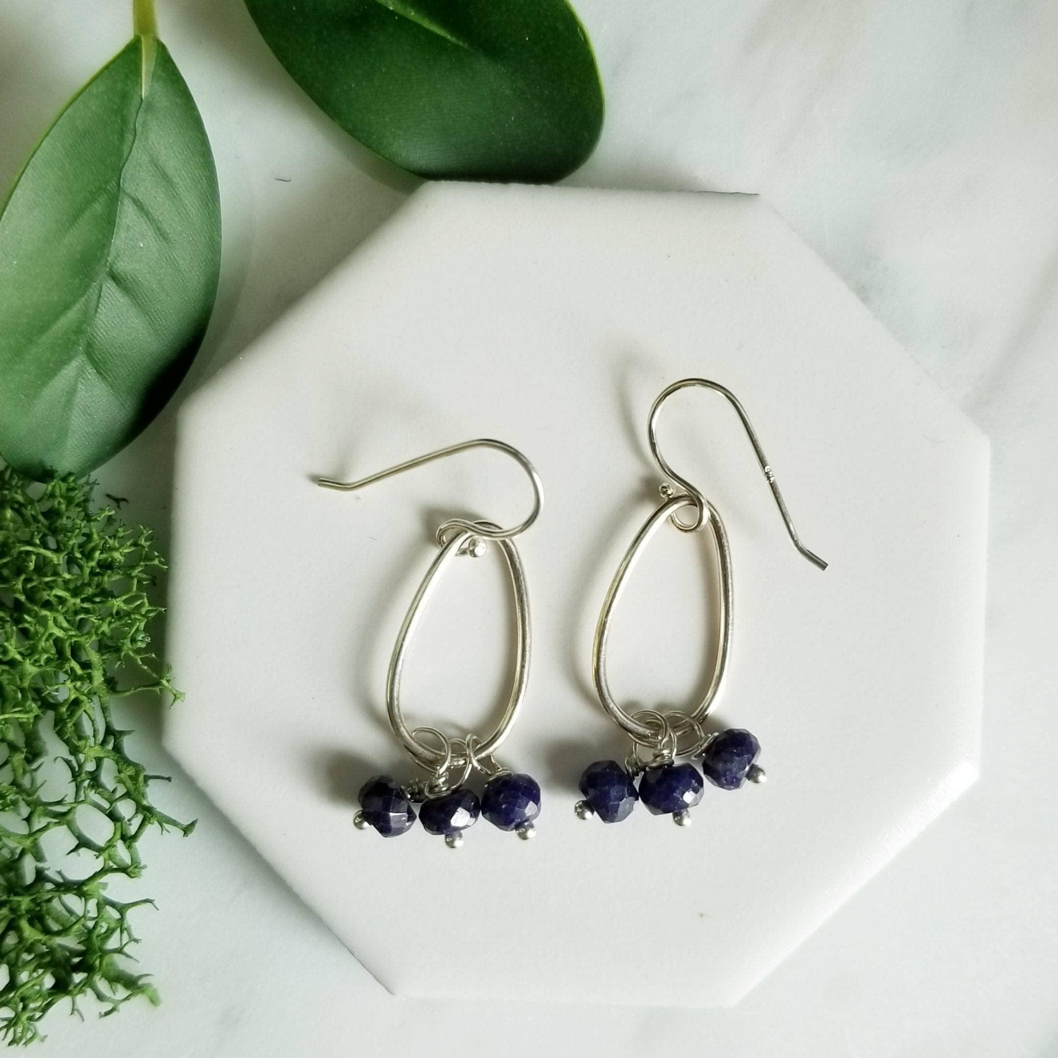 Faceted blue sapphire stones are wire-wrapped to a oval wedge shaped sterling silver earring.