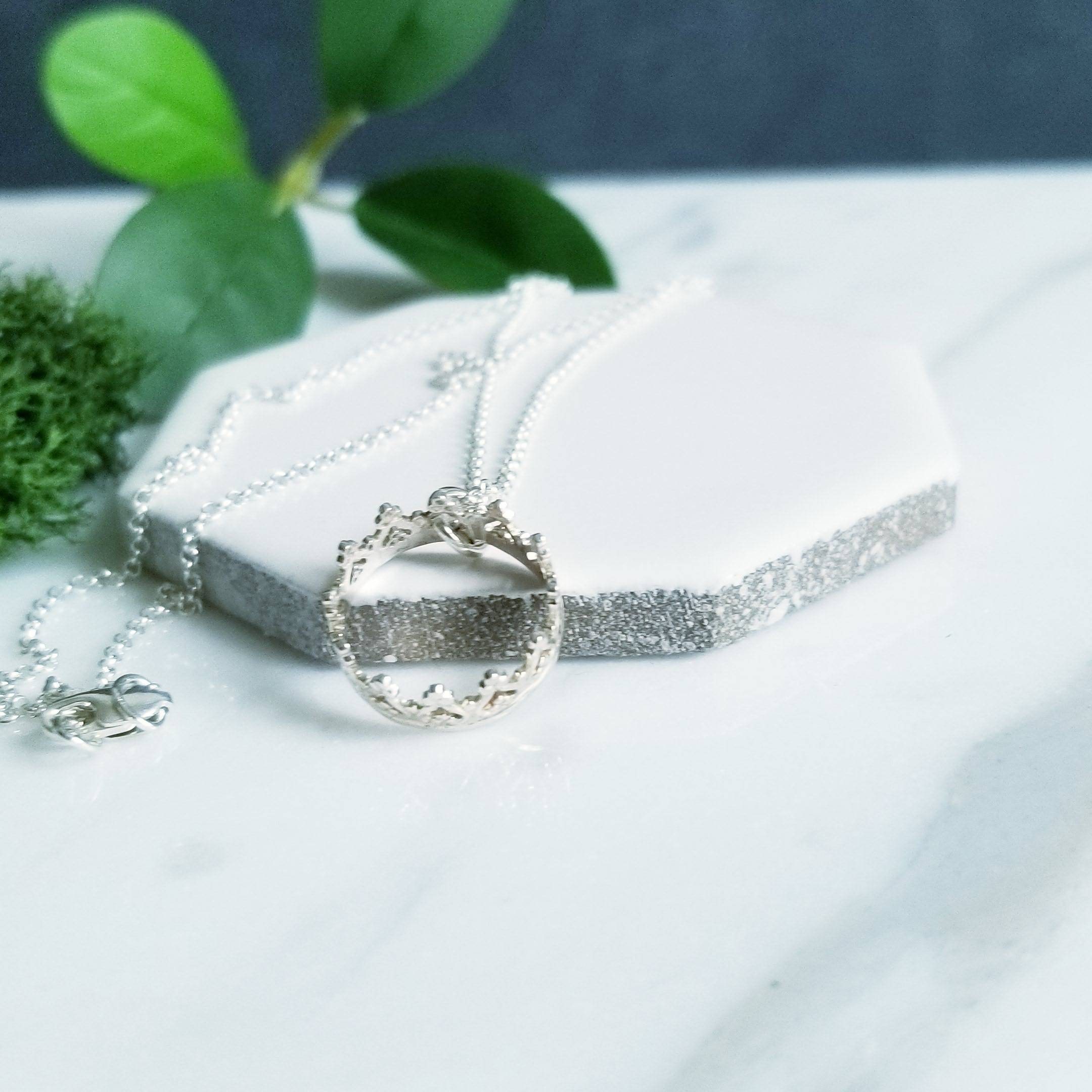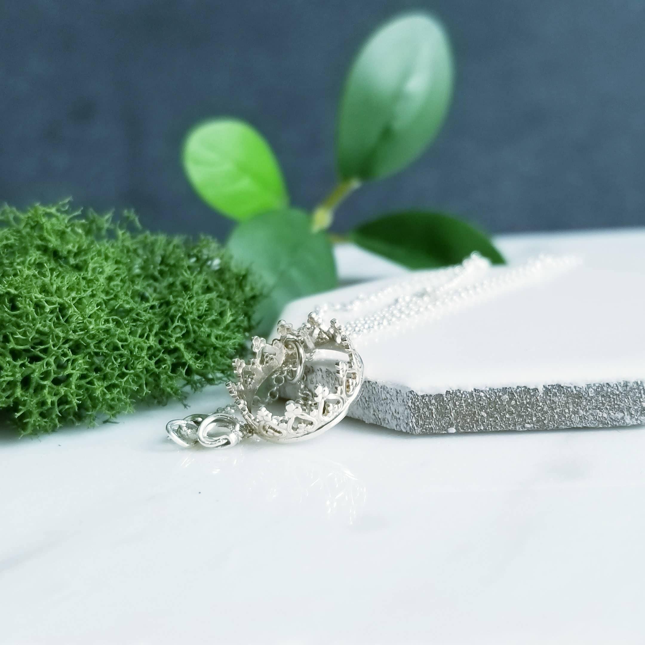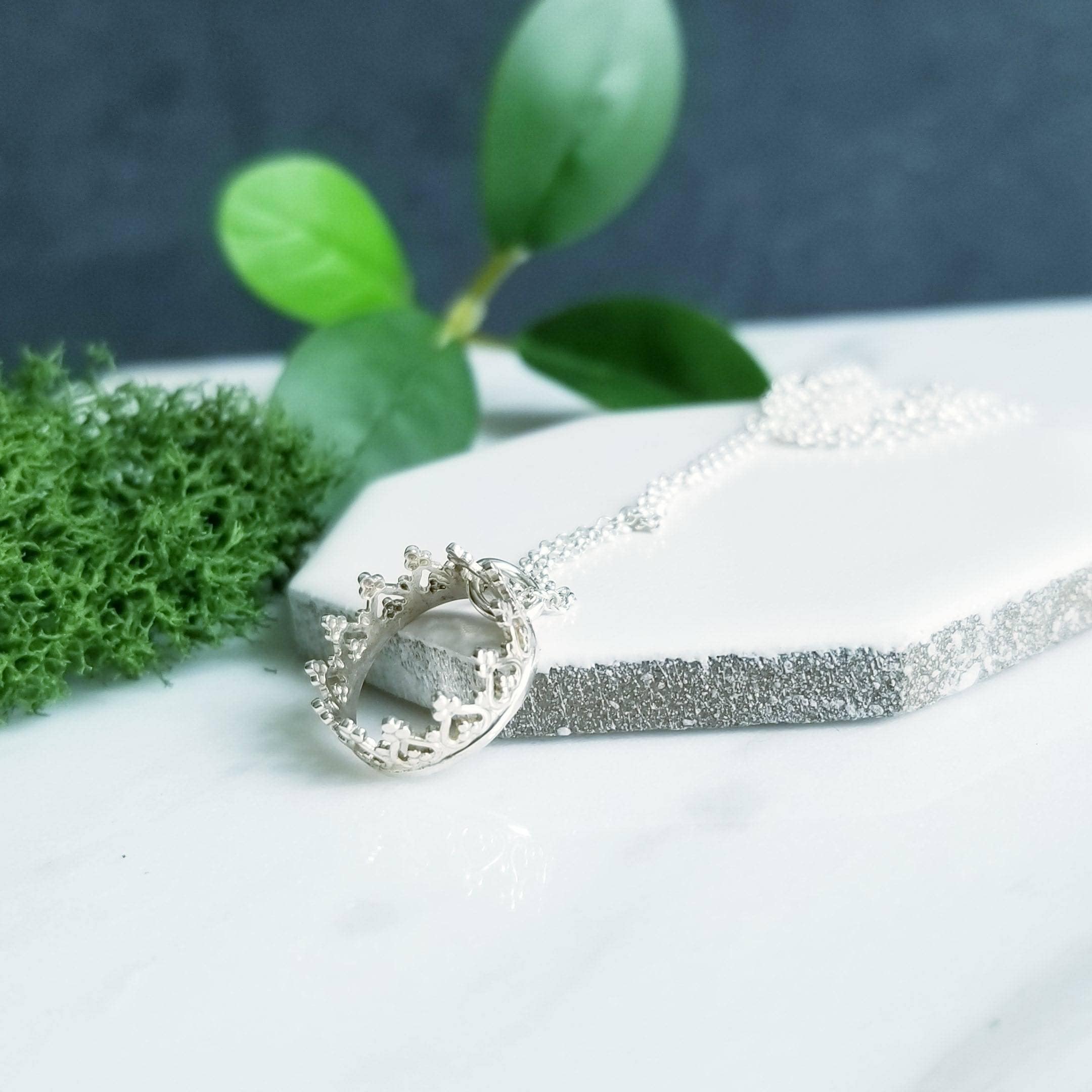 A small open crown is suspended like a charm from a light sterling silver chain.