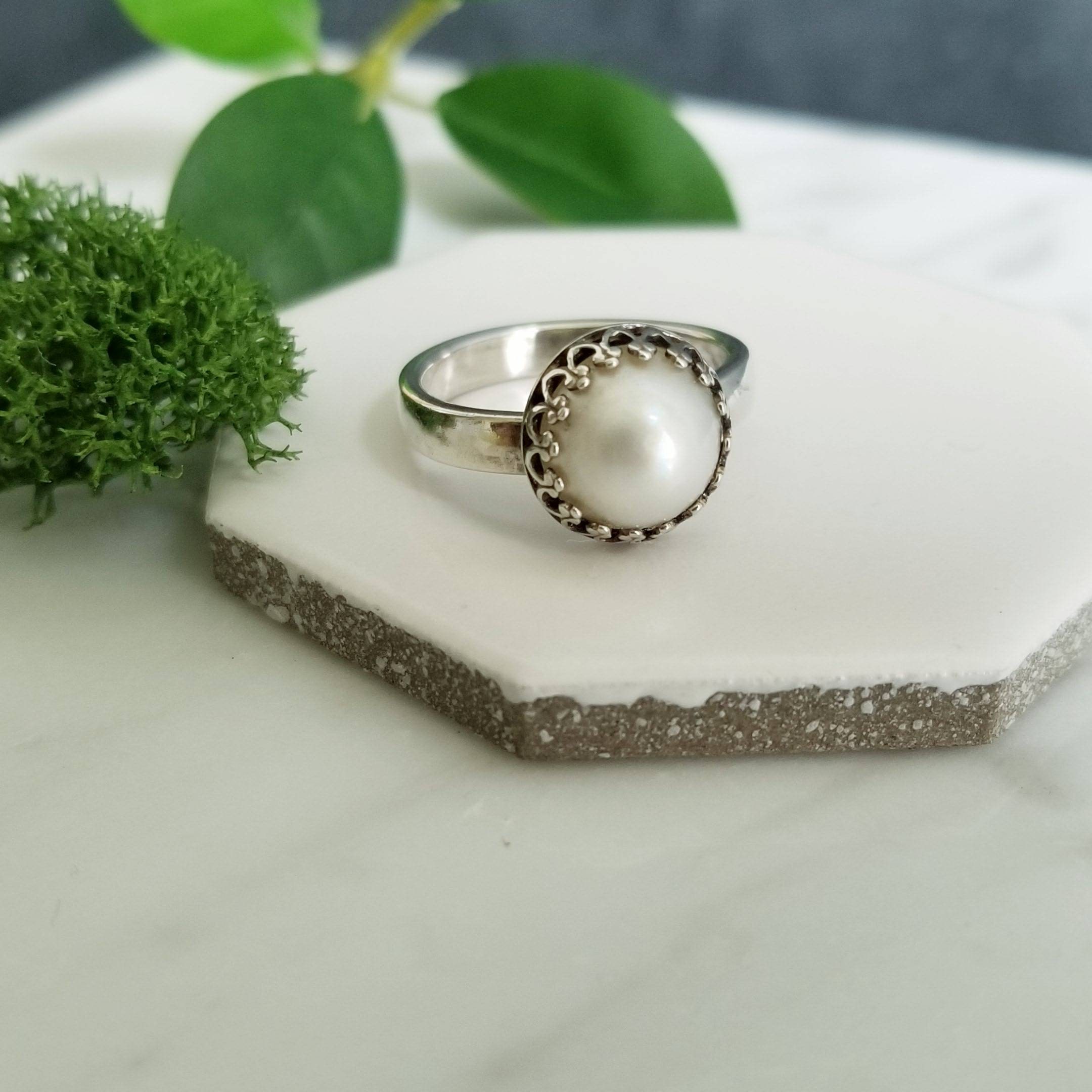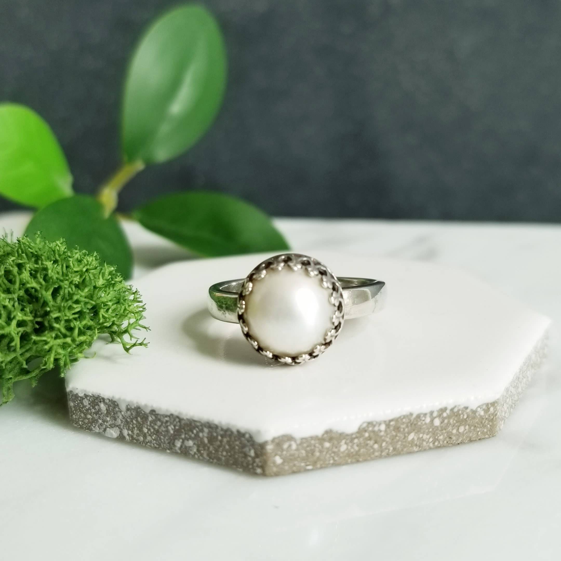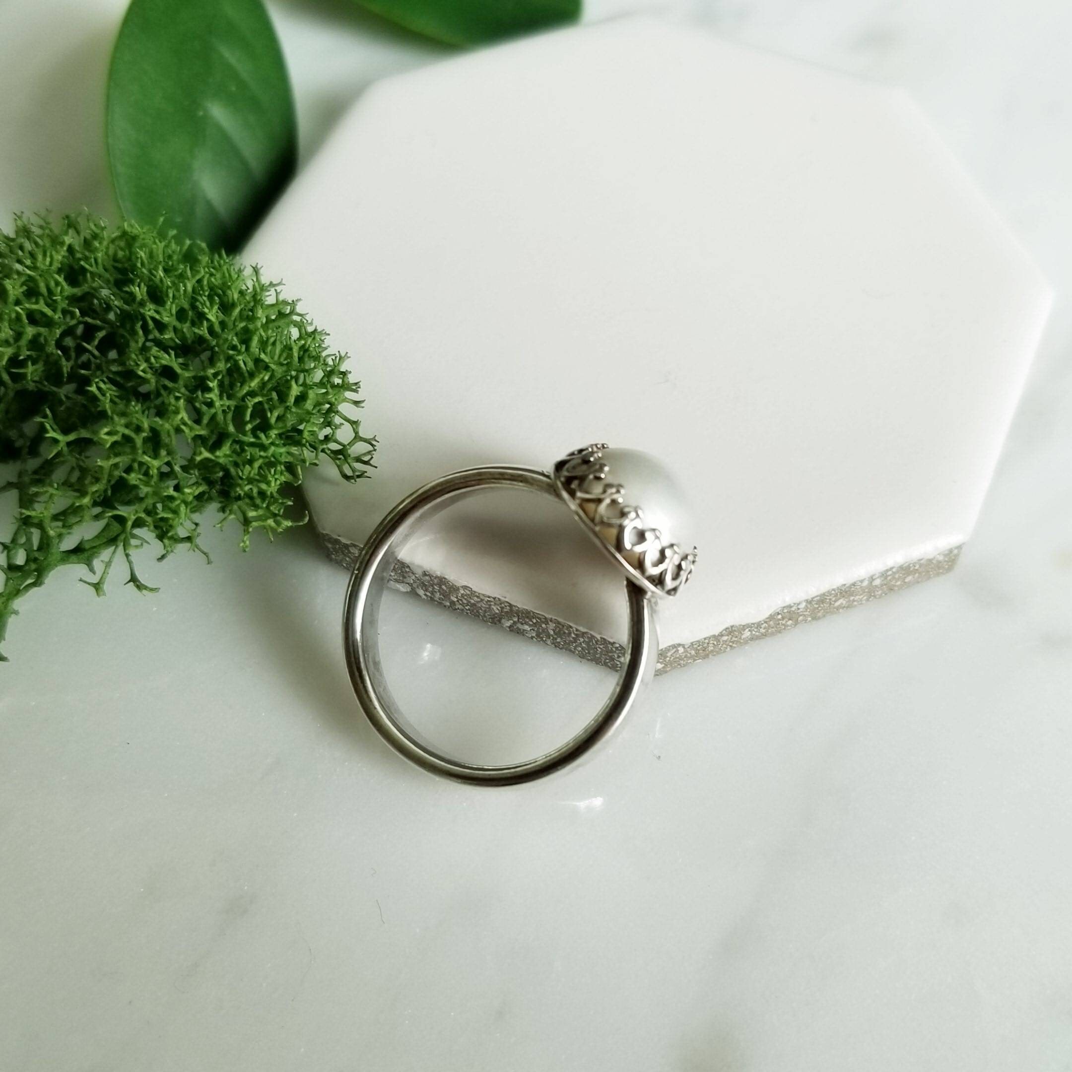 White Pearl cabochon in set in an ornate crown setting on a simple sterling silver comfort band ring.