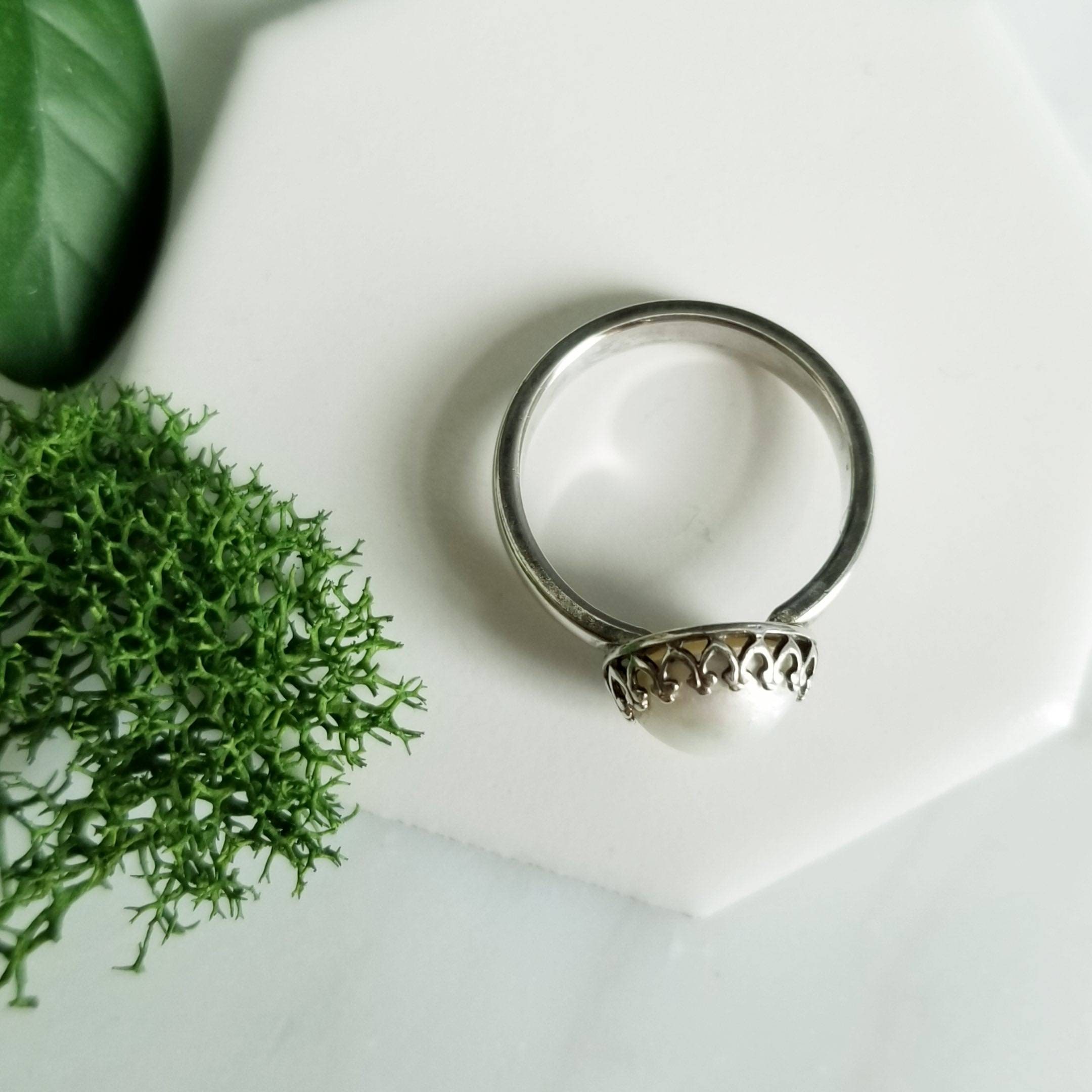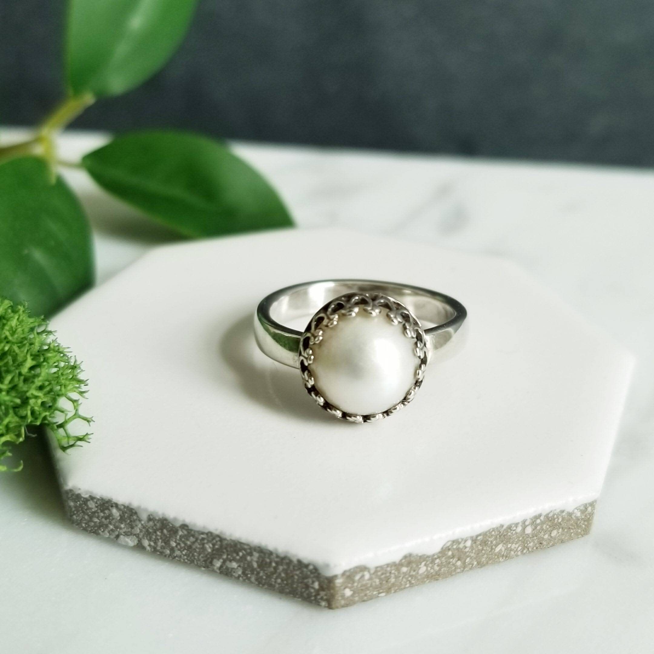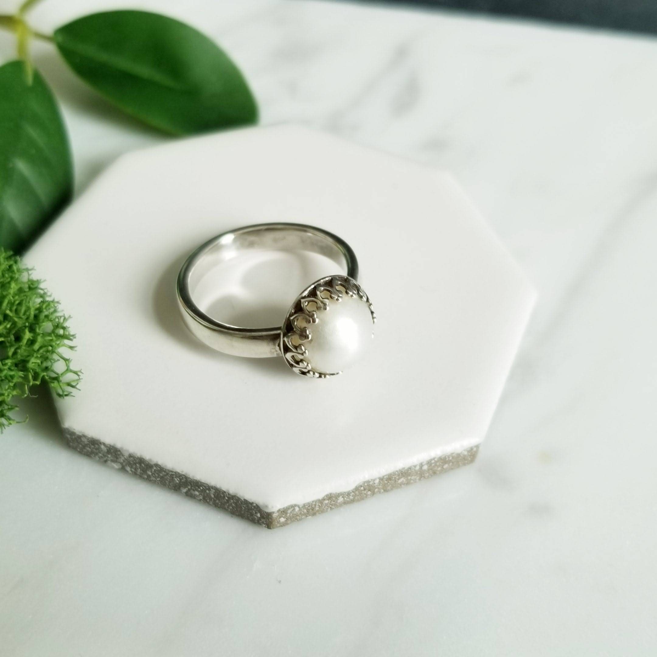 White Pearl cabochon in set in an ornate crown setting on a simple sterling silver comfort band ring.
